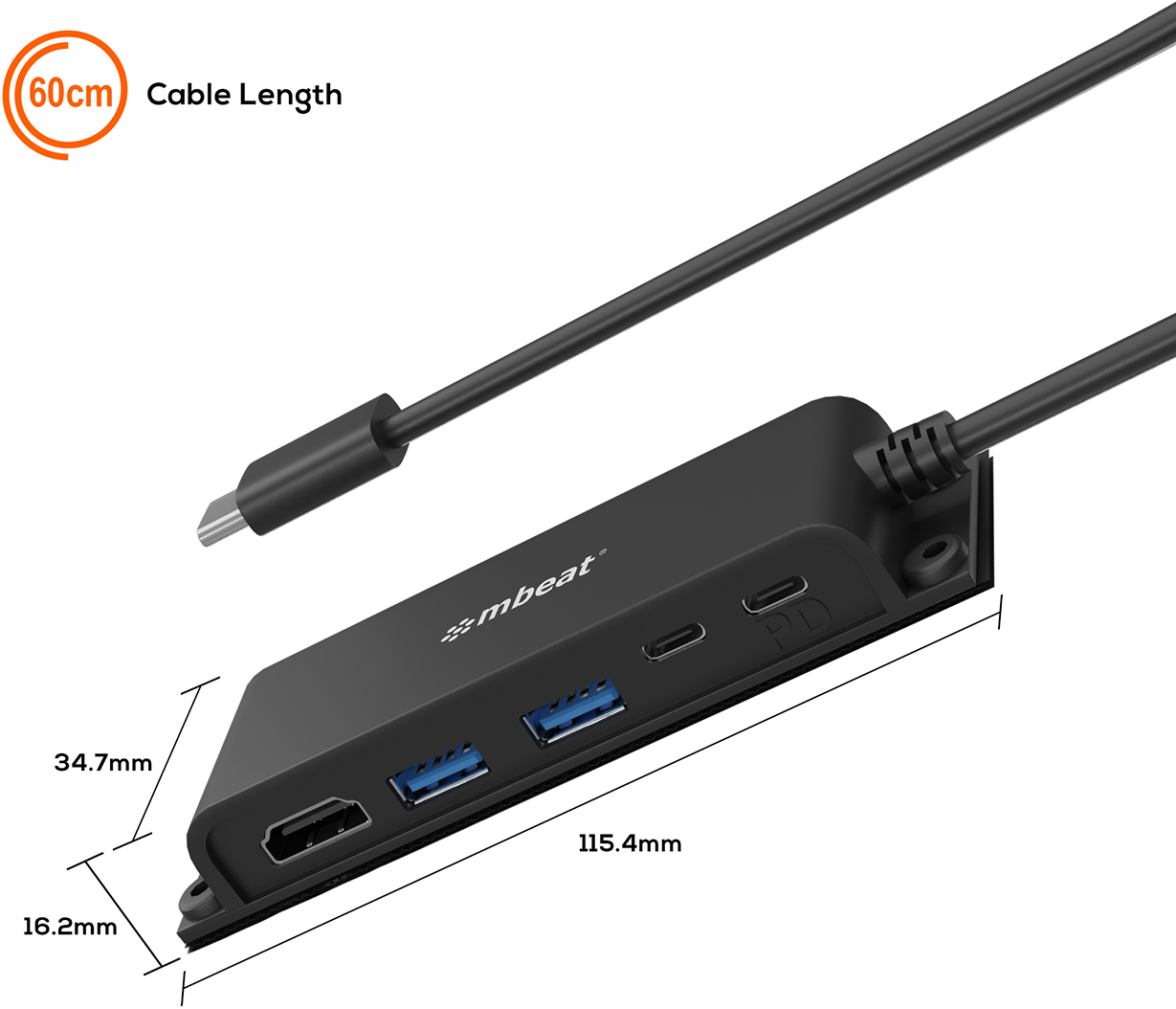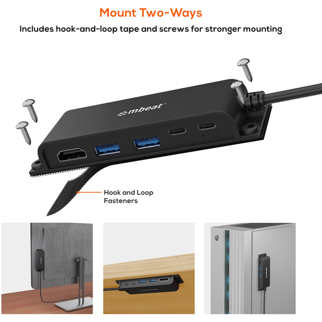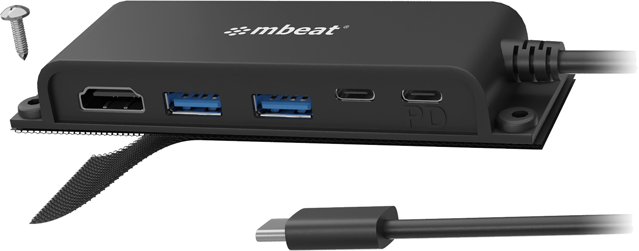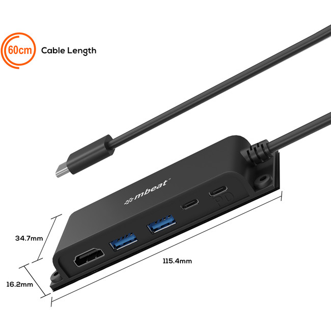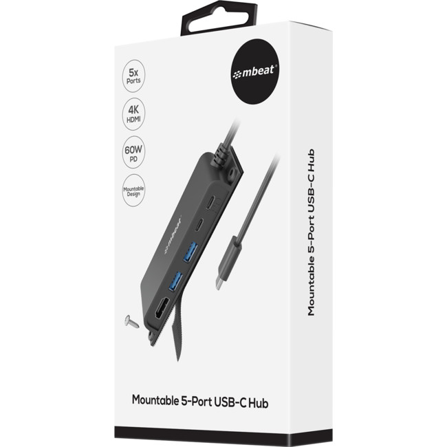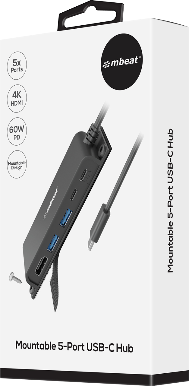 • 5-Port USB-C multifunction hub for instant port expansion. • Supports 4K HDMI video out and 60W PD charging with 2 × USB3.0 and 1 × USB-C. • 60cm extra-long data cable to accommodate any configuration. • Space-saving mounting solutions for handy access to additional ports.