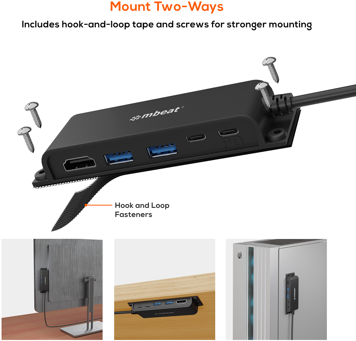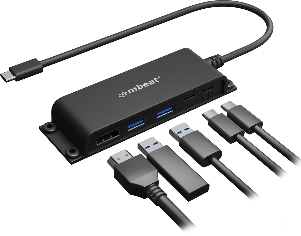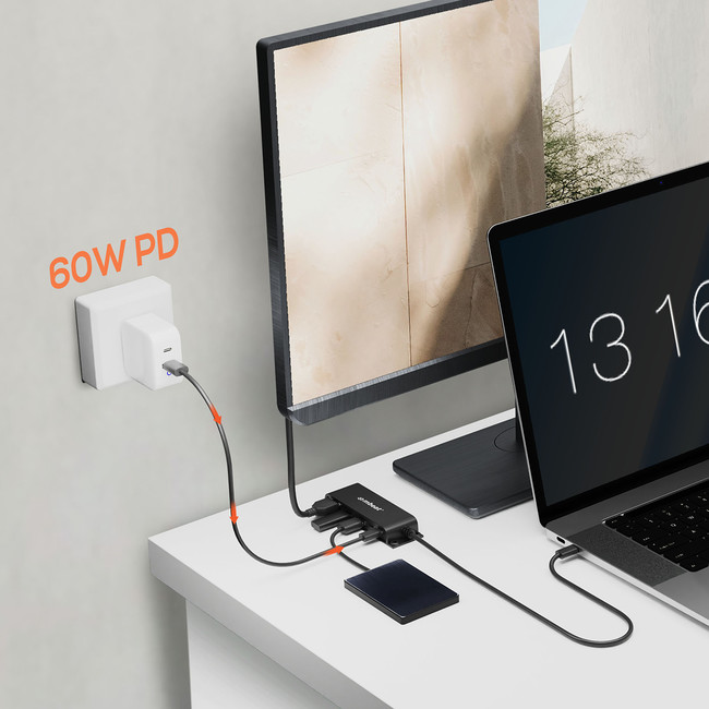 • 5-Port USB-C multifunction hub for instant port expansion. • Supports 4K HDMI video out and 60W PD charging with 2 × USB3.0 and 1 × USB-C. • 60cm extra-long data cable to accommodate any configuration. • Space-saving mounting solutions for handy access to additional ports.