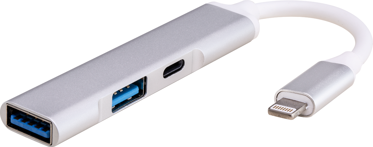 • Lightning plug to 2x USB-A 3.0 sockets and 1x lightning interface;