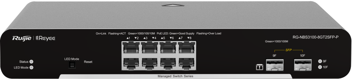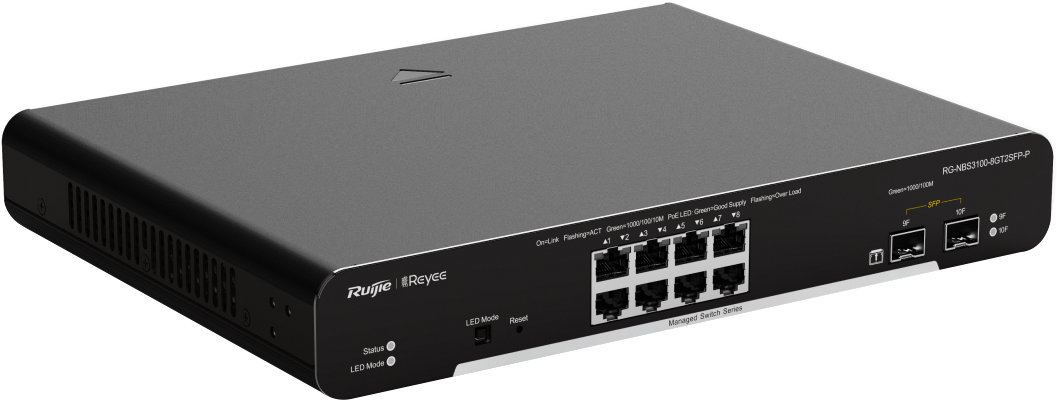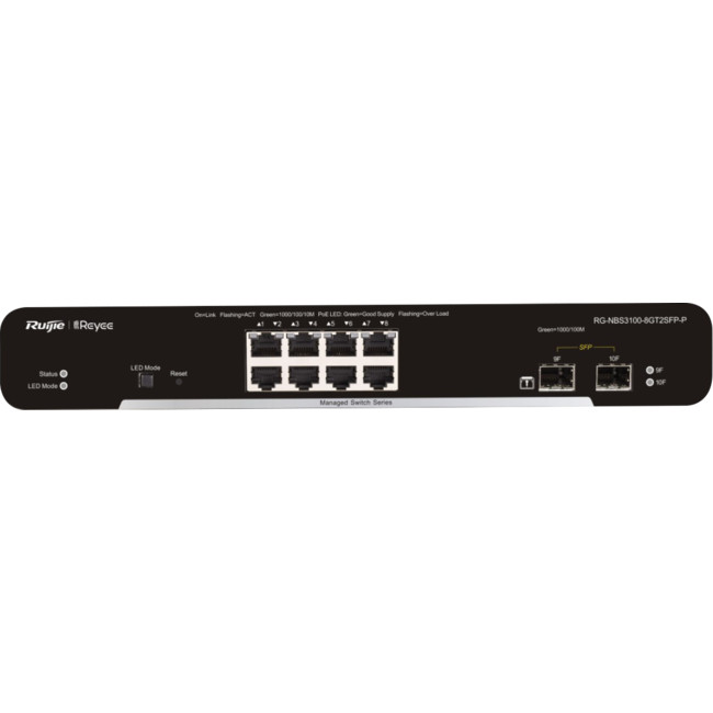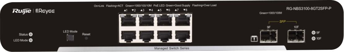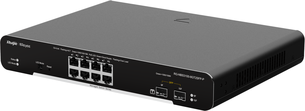 Ruijie Reyee RG-NBS3100-8GT2SFP-P 8-Port L2 Managed PoE Switch, 8x Gigabit PoE , 2x SFP, 125W is one of the Ruijie Real-easy RG-NBS3100 Managed Switch Series which consists 4 models of switches designed for SME customers to meet their different network needs including basic VLAN division and advanced security features such as ACL