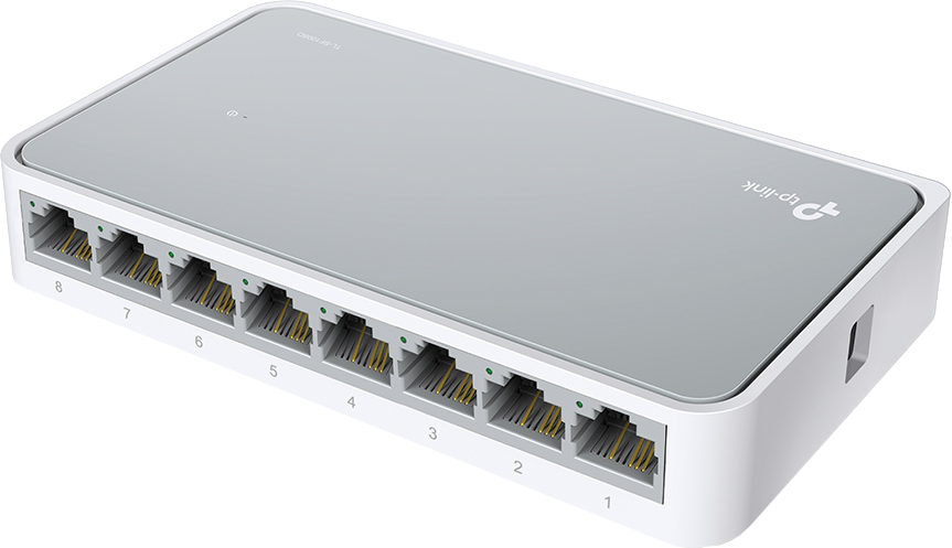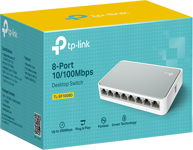 The TP-LINK TL-SF1008D 8-port 10/100M Fast Ethernet Switch provides you with a low-cost, easy-to-use, high-performance, seamless and standard upgrade to improve your old network to a 100 Mbps network. It will boost your network performance up to full duplex data transfer. Its wire-speed switching that forwards packets can be as fast asthe speed that your network delivers those packets to them.
