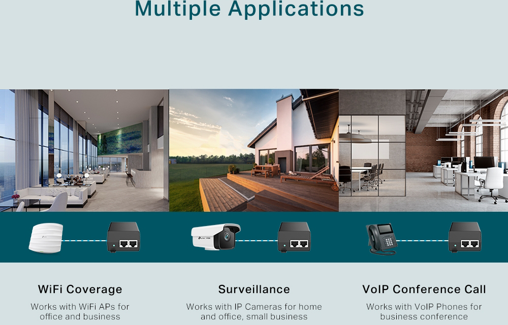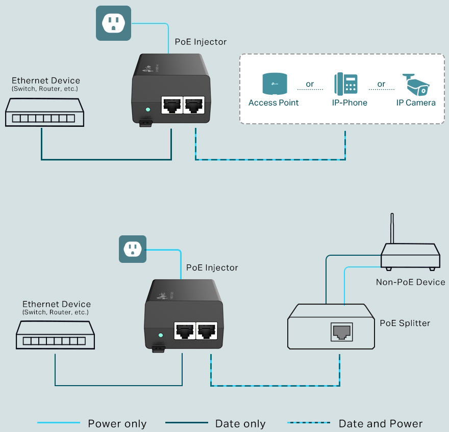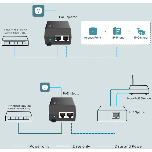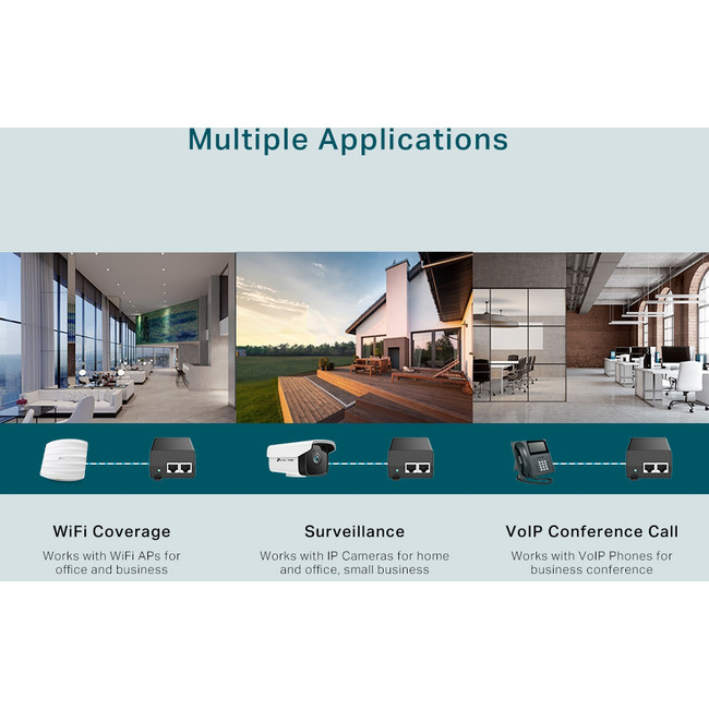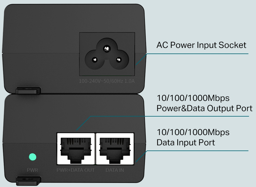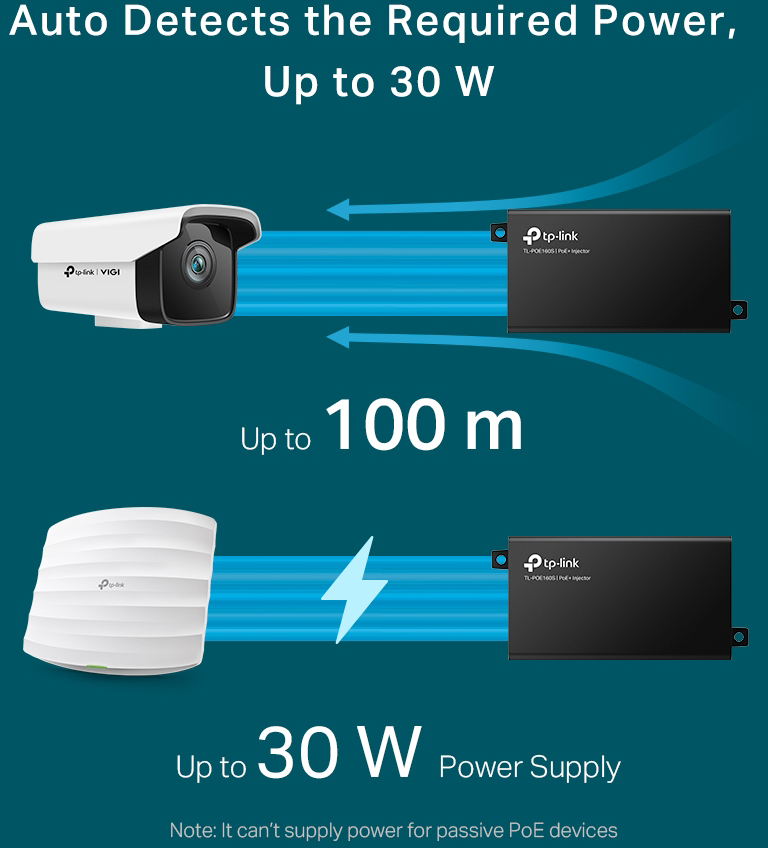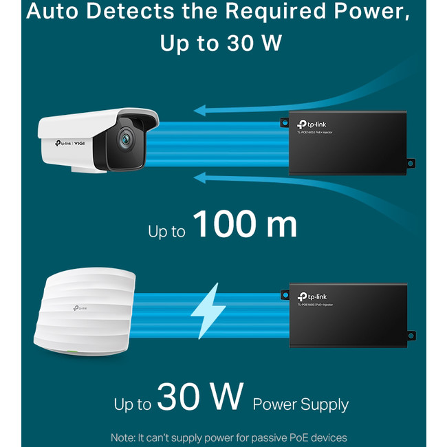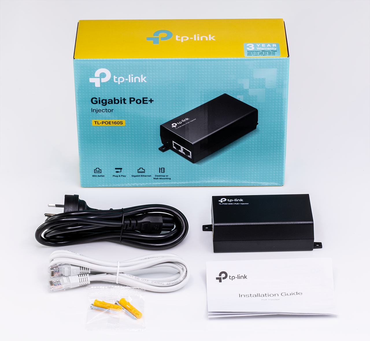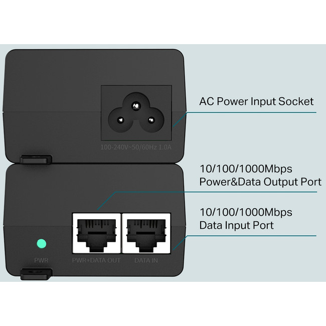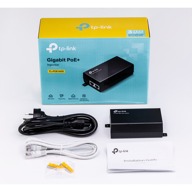 TP-Link TL-POE160S PoE Injector • 2 Gigabit ports ensure faster transmission • Complies with IEEE802.3af/at standards, supplies up to 30 W • Reduces infrastructure costs by transmitting data and power simultaneously via an Ethernet cable • Automatically determines and supplies the exact power to meet the device's need • Wall-mounting and desktop design accommodates most installation scenarios • Plug & Play installation, requires no configuration • Integrated power supply • 250V 10A Mains Power Supply Cable included NETWORK Standards and Protocols IEEE802.3i, IEEE802.3u, IEEE802.3ab, IEEE802.3af, IEEE802.3at GENERAL Certification FCC, CE, RoHS Environment Operating Temperature: 0°C to 40°C (32°F to 104°F) Storage Temperature: -40°C to 70°C (-40°F to 158°F) Operating Humidity: 10% to 90%RH non-condensing Storage Humidity: 5% to 90%RH non-condensing HARDWARE FEATURES Network Media 10BASE-T: UTP category 3, 4, 5 cable (maximum 100 m) EIA/TIA-568 100Ω STP (maximum 100 m) 100BASE-TX: UTP category 5, 5e cable (maximum 100 m) EIA/TIA-568 100Ω STP (maximum 100 m) 1000BASE-T: UTP category 5, 5e, 6 cable(maximum 100 m) Ports 1 10/100/1000Mbps RJ45 data-in port 1 10/100/1000Mbps RJ45 power data-out port 1 AC socket Power Consumption Input: 100-240 V, 50/60 Hz Output: Auto-determine the necessary power requirements (max. 30 W) Basic Function Auto-Sensing Algorithm enables providing power with 802.3af/at PD Auto-determine the necessary power requirements Wall-mounting and desktop installation supported Plug-and-Play LED Indicator ON: Supplying power normally OFF: No power supply Dimensions ( W x D x H ) 4.9*2.3*1.4 in (125*59.4*36.8 mm)