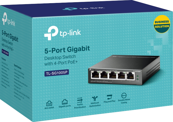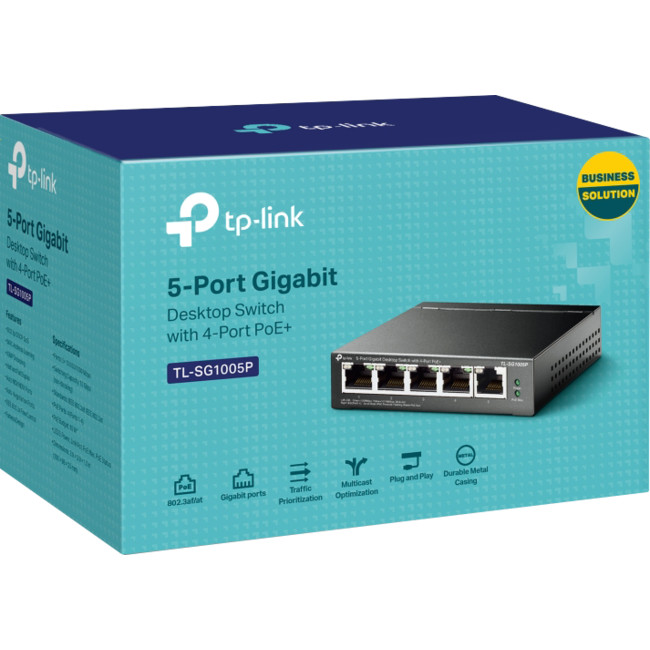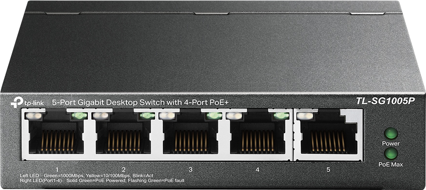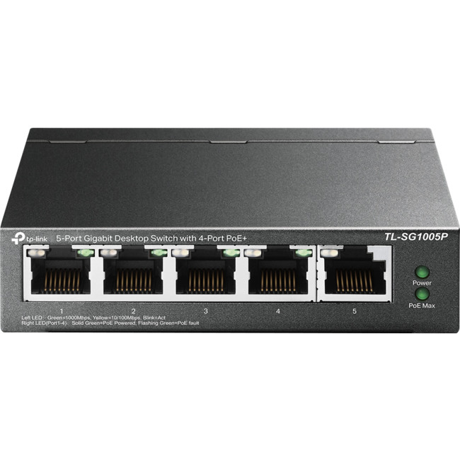 5 10/100/1000Mbps RJ45 portsWith four PoE ports, transfers data and power on one single cableWorking with IEEE 802.3af compliant PDs, expands home and office network802.1p/DSCP QoS enable smooth latency-sensitive trafficSupports PoE Power up to 15.4W for each PoE portSupports PoE Power up to 65W for all PoE portsRequires no configuration and installationHARDWARE FEATURESInterface • 5× 10/100/1000Mbps RJ45 Ports• AUTO Negotiation• AUTO MDI/MDIXNetwork Media • 10BASE-T: UTP category 3, 4, 5 cable (maximum 100m)• EIA/TIA-568 100Ω STP (maximum 100m)• 100BASE-TX: UTP category 5, 5e cable (maximum 100m)• EIA/TIA-568 100Ω STP (maximum 100m)• 1000BASE-T: UTP category 5, 5e, 6 or above cable (maximum 100m)• EIA/TIA-568 100Ω STP (maximum 100m)Fan Quantity FanlessExternal Power Supply External Power Adapter (Output: 53.5 VDC / 1.31 A)Packet Forwarding Rate 7.44 MppsPoE Ports (RJ45) • Standard: 802.3 af/at compliant• PoE Ports: Ports 1–4• Power Supply: 65 WMac Address Table 2KJumbo Frame 16 KBSwitching Capacity 10 GbpsDimensions ( W x D x H ) 3.9×3.9×1.0 in (99.8×98×25 mm)Max Power Consumption • 4.29 W (220/50 Hz. no PD connected)• 74.24 W (220/50 Hz. with 65 W PD connected)Max Heat Dissipation • 14.63 BTU/h (no PD connected)• 253.16 BTU/h (with 65 W PD connected)SOFTWARE FEATURESAdvanced Features • Compatible With IEEE 802.3af/at Compliant PDs• Mac Address Auto-Learning And Auto-Aging• IEEE 802.3x Flow Control• 802.1p/DSCP QoS• IGMP Snooping