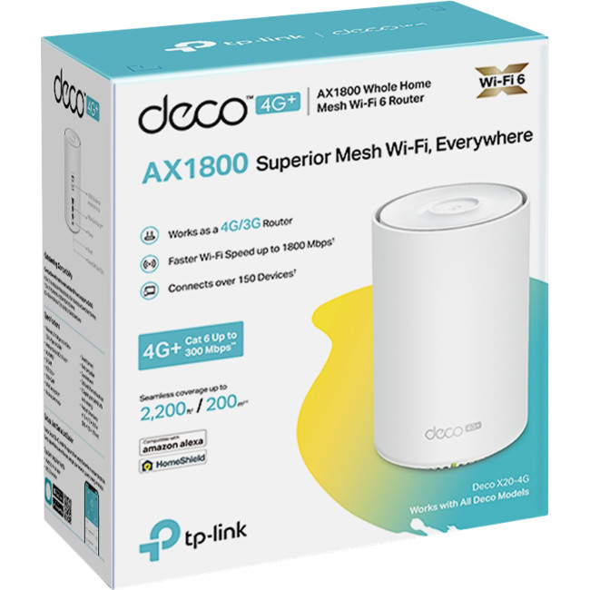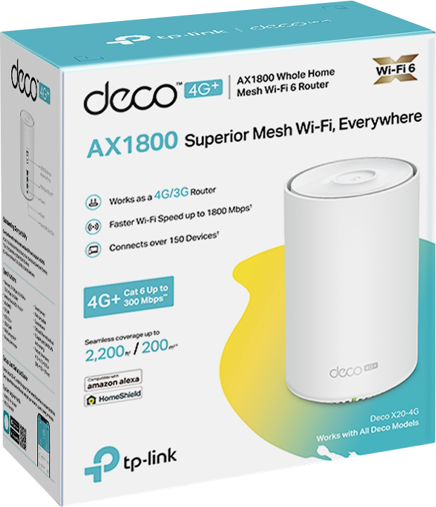 • Internet Everywhere with 4G Speed - Provides WiFi6 Mesh coverage through 4G CAT6 access • Superior WiFi 6 speeds up to 1.8 Gbps - 1201 Mbps (5 GHz) and 574 Mbps (2.4 GHz) dual band WiFi with WiFi 6 technology • Fully Gigabit Ethernet - 3x Gigabit WAN/LAN Ethernet ports provide flexible internet access at warp speed • TP-Link HomeShield - Real-time IoT and network protection, robust Parental Controls, and comprehensive reports • 3G/4G Failover - Flexible access from Ethernet to 3G/4G to prevent data loss Hardware
