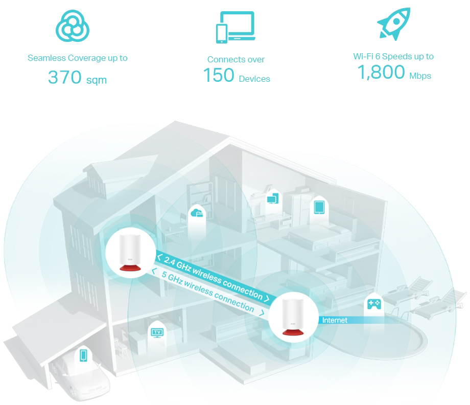 Armed with WiFi 6 technology, Deco whole home Mesh WiFi is designed to deliver a huge boost in coverage, speed, and total capacity. Deco Voice X20 (1-Pack) ensures that you have a stable, high-speed internet experience in any part ofyour home.