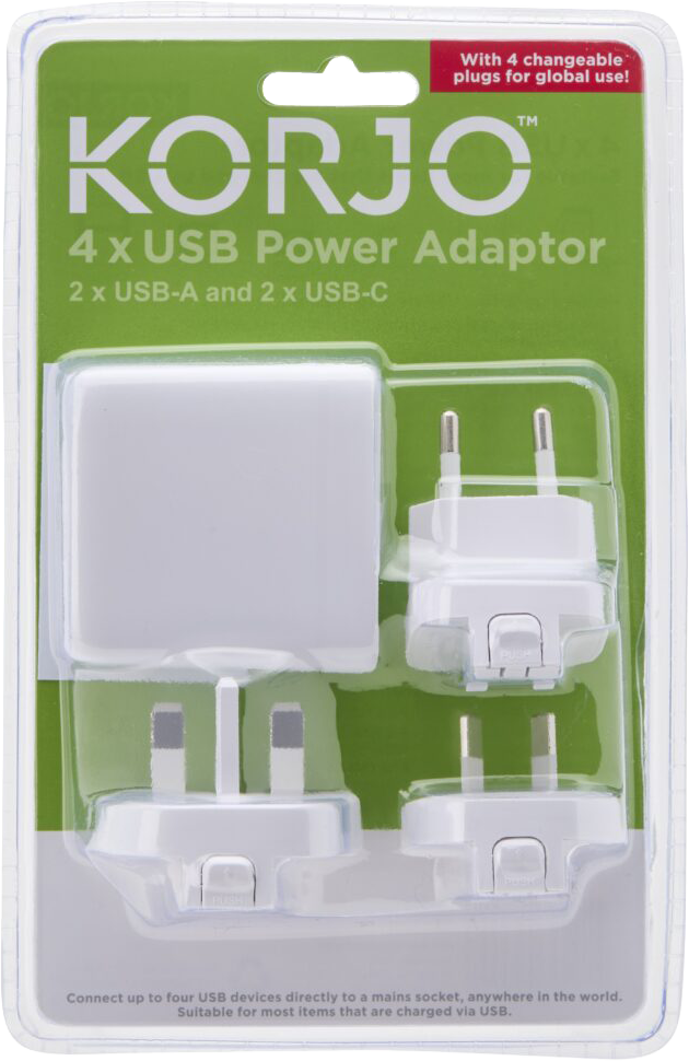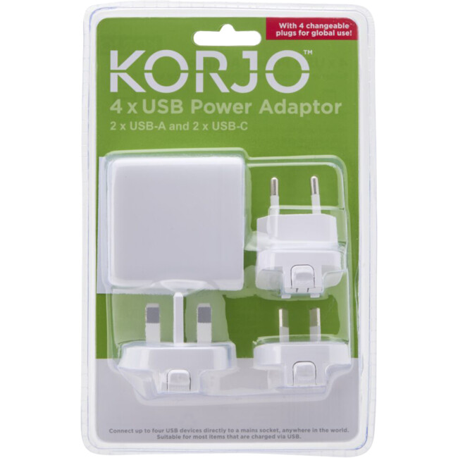The Korjo USB A&C 4 port Power Hub is a clever way to charge up to four USB devices when travelling or at home. It has 4 interchangeable pin configurations, so that you can use it almost anywhere in the world.