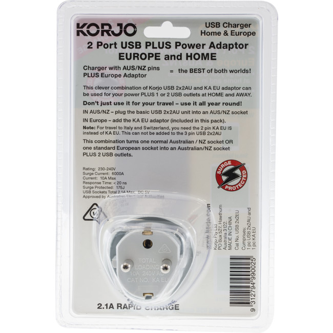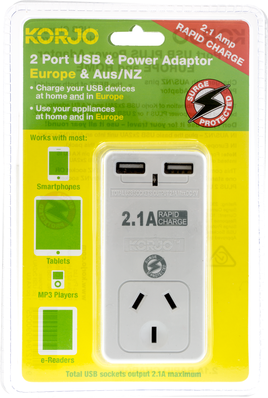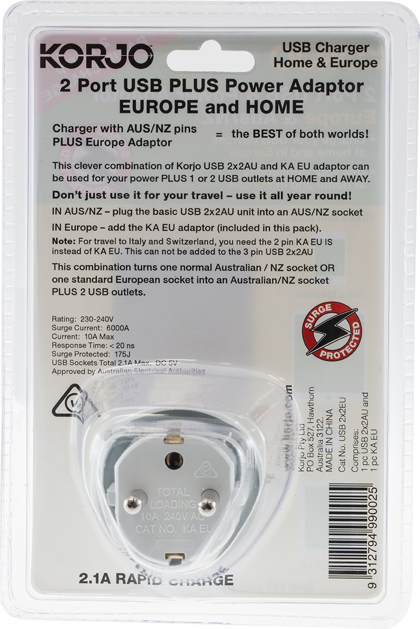 CHARGE your USB devices at home and in EUROPE and power your electrical appliances at te same time in the same socket Charger with AUS/NZ PLUS Europe adaptor = the bestof both worlds! Don't just use it for your travel - use it all year round This clever combination of Korjo USB 2x2AU and KA EU adaptor can be used for your power PLUS 1 or 2 USB outlets at HOME and AWAY. Turns one normal Aus/NZ socket or one standard EU socket into an Aus/NZ socket PLUS 2 USB outlets