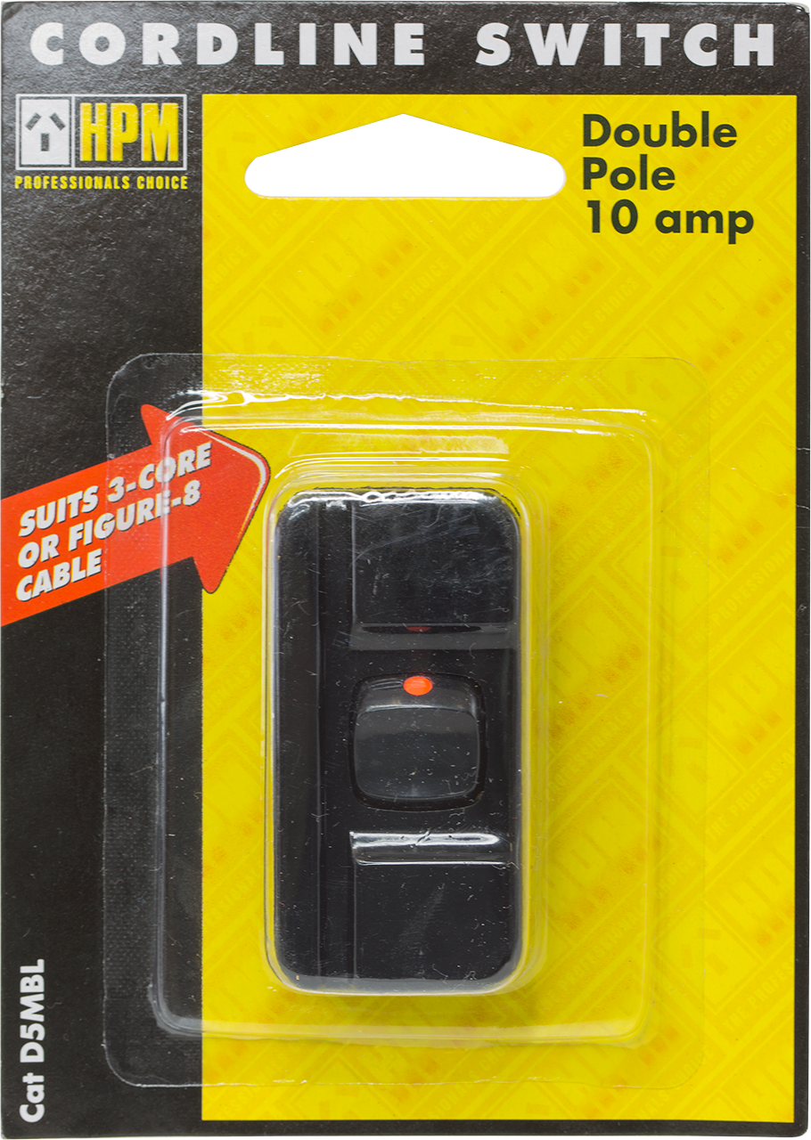 Black Double pole in-line switch for flat or round cable,2-3 core with dual reversible cable clamp.