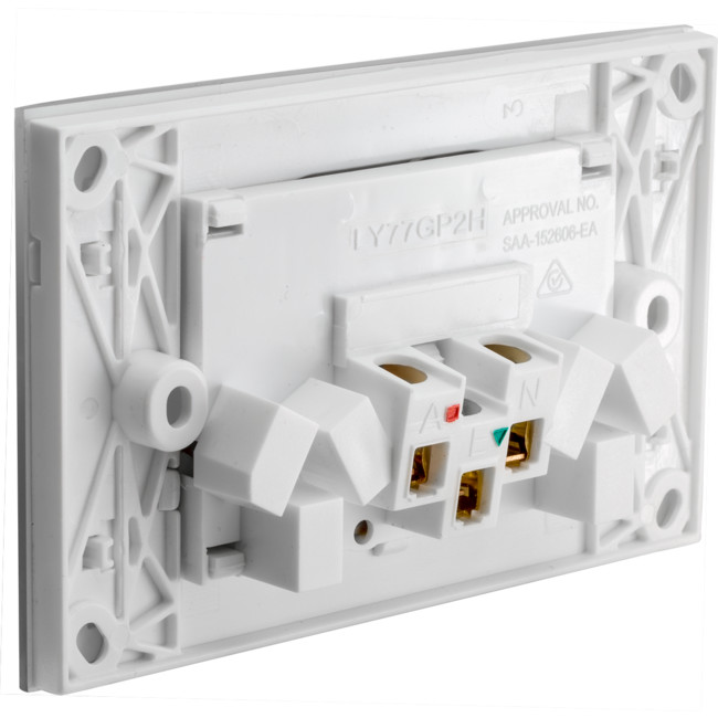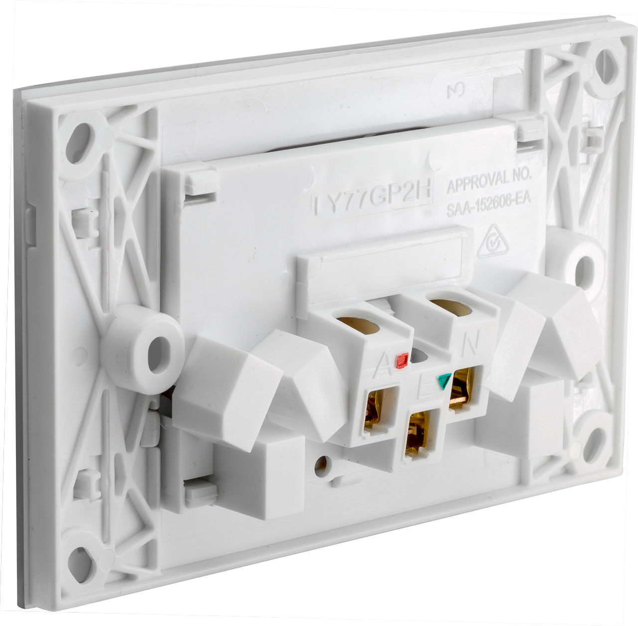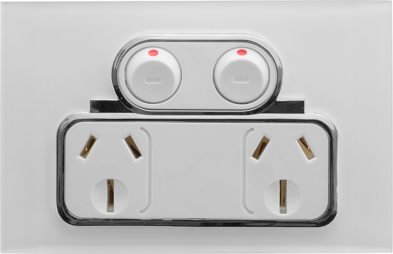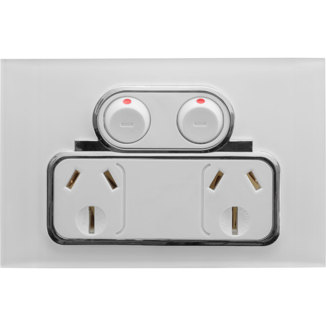 The Acrylic plate double power point has a plate size of 74mm by 115mm. 2-way on-off switch for each point