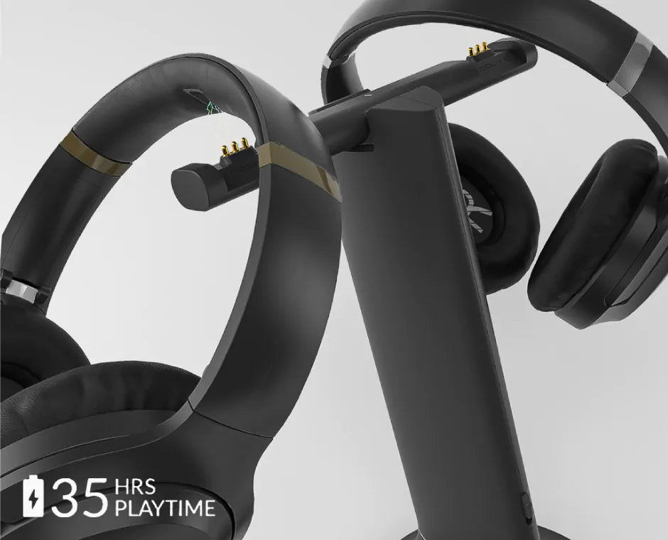 Each headphone in the Duet set can run up to 35 hours perfull charge – more than enough for a full day of binge-watching. When the battery is low, the transmitter base doubles as a charging dock; simply place the headphonesonto the charging dock, they’ll start charging and be ready again within 1.5 hours.