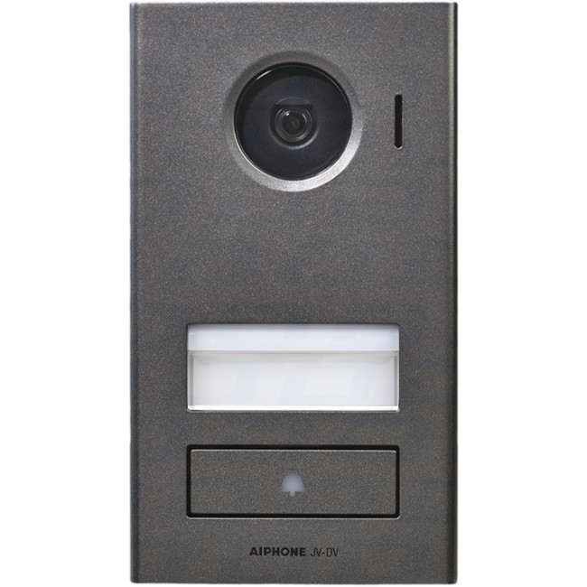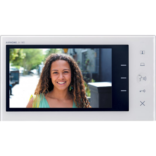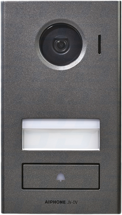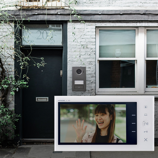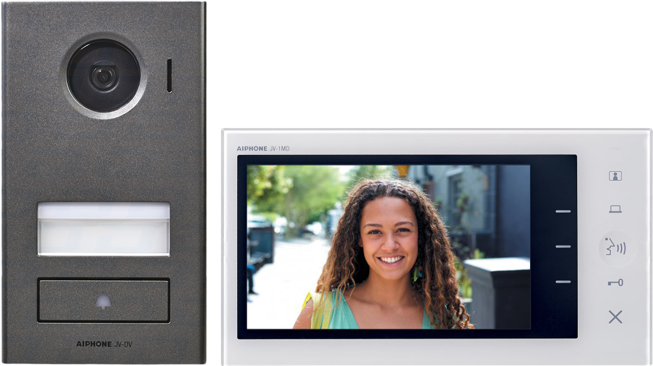 The Master station features a 7″ screen to view visitors and configure settings. The electrostatic touch buttons to the right of the screen allow users to unlock the door and activate an exterior device. There are multiple call tone options available for the station. Communication with the door station can either be hands-free or push-to-talk. Still images from past calls can be viewed and deleted from the station. The station can store up to 30 images. Wiring for the system is 2-conductor between the JV-1MD and the door station (Aiphone 871802 PE insulated 18/2 cable is recommended).