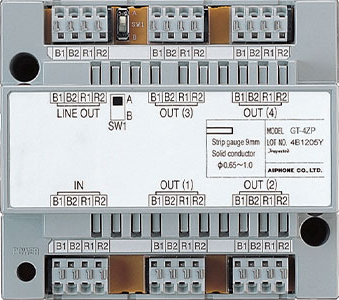 The GT-4ZP replaces existing GT-4Z adaptors in a standard GT system, and requires 1 PS-2420UL per GT-4ZP. Each GT-4ZP includes 4 power jumpers (GTW-24J) that are to be installed on the GT-1C7W between the B1/B2 and /- terminals, which provides power to the GT-1C7W without having to install a local PS-2420UL for each tenant station.