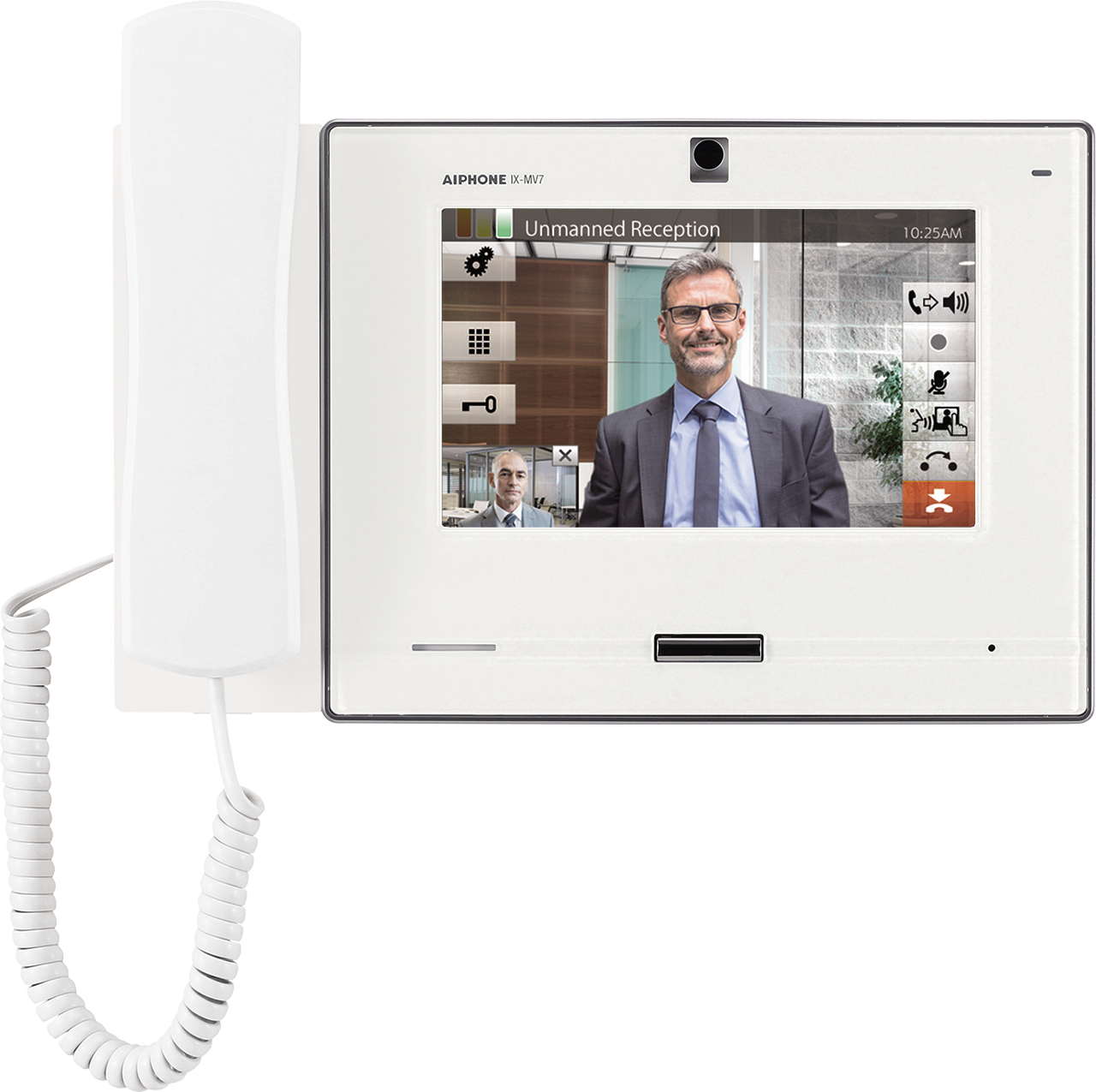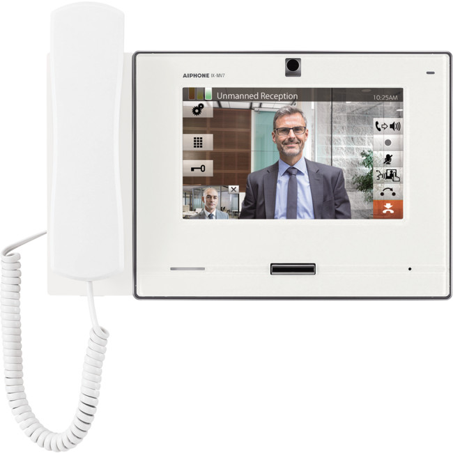 Aiphone IX-MV7-HW is an IP master station with a large 7"touchscreen display, handset, and integrated 720p camera.