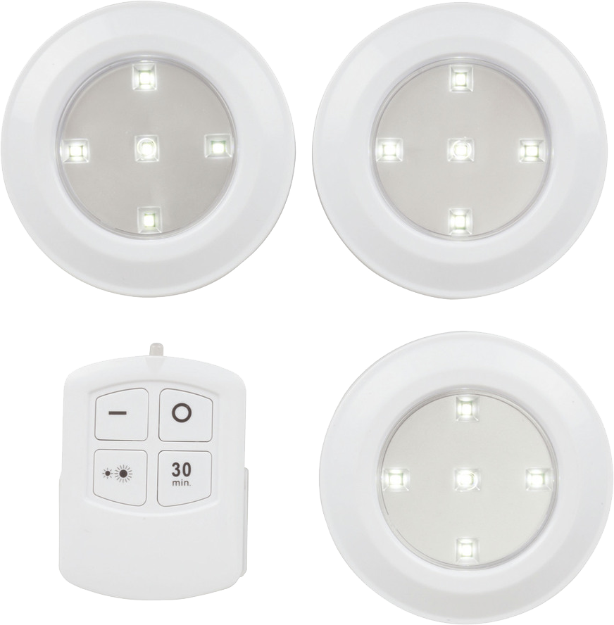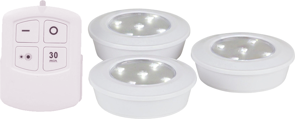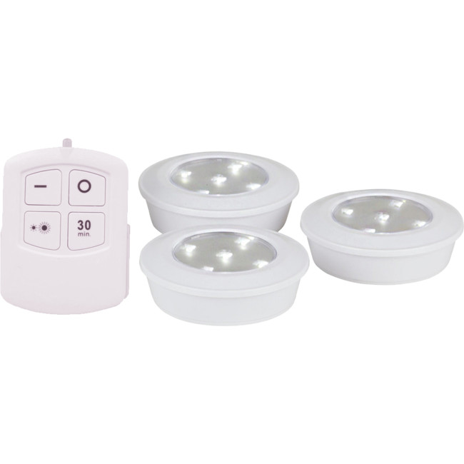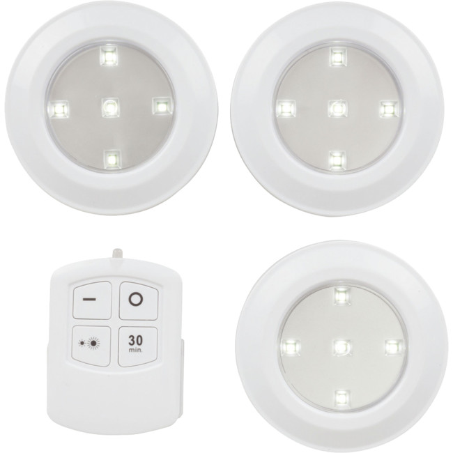 This amazing kit of three LED puck lights takes the hassle out of adding lighting to, well - just about anywhere! Each puck light contains not one, two, or three, but 5 ultra bright LEDs. There’s no pesky wiring to get them to work though - just install three of your favourite AA batteries in to each light and put them in a location that’s begging to end the darkness. The included adhesive tabs also mean no screws are required! Butthese aren’t your average puck lights, there’s acentral remote control to control them all! The remote control then caters for centralised on and off functionality, as well as a “low brightness” dimsetting, or set them to turn off in 30-minutes automatically. Not near the remote? Simply press a puck light and it will turn on for you too. Amazing!