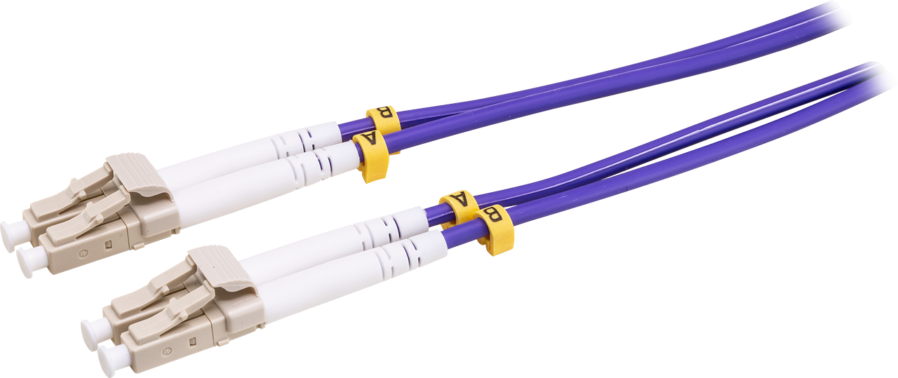 OM4 Laser-Optimized Multimode Fiber (LOMMF) "Aqua" cables, is used for 10/100Gb Ethernet applications. These new technology, 50/125um, LC/LC OM4 Fiber Optic Patch Cord, provide nearly three times the bandwidth over conventional 62.5um multimode fiber, with performance rivaling that of Singlemode cable, at a much reduced cost. LOMMF cable allows 10/100Gb serial transmission over extended distances in the 850nm wavelength window, where low-cost Vertical Cavity Surface Emitting Lasers (VCSELs) enable a cost-effective, high-bandwidth solution.