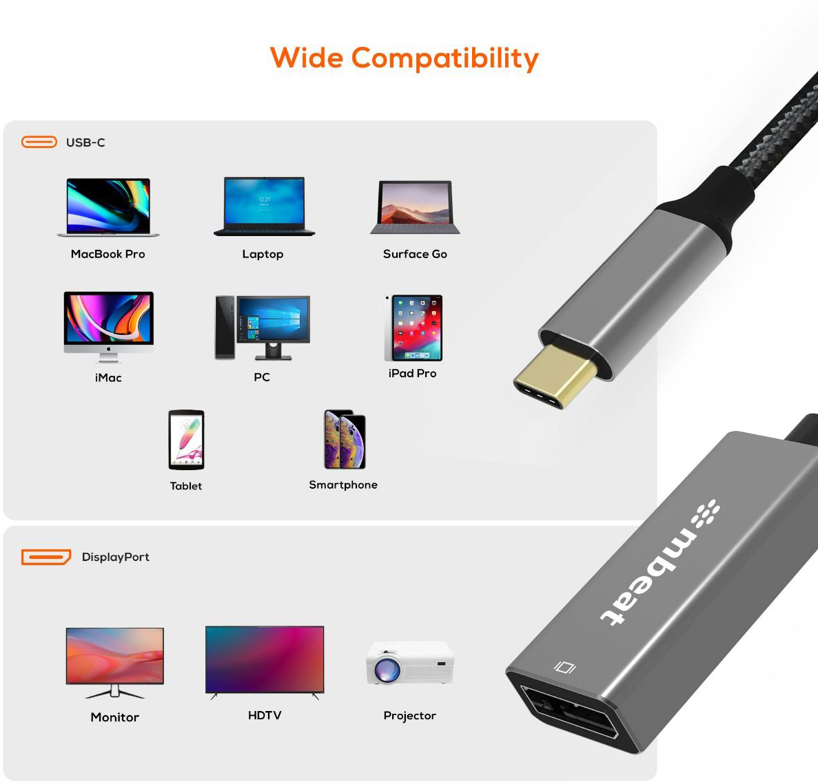 • Converts USB-C to DisplayPort female port,allowing computers or laptops with USB-C port to use DisplayPort cables to connect monitors, projectors, or HDTVswith DisplayPort.