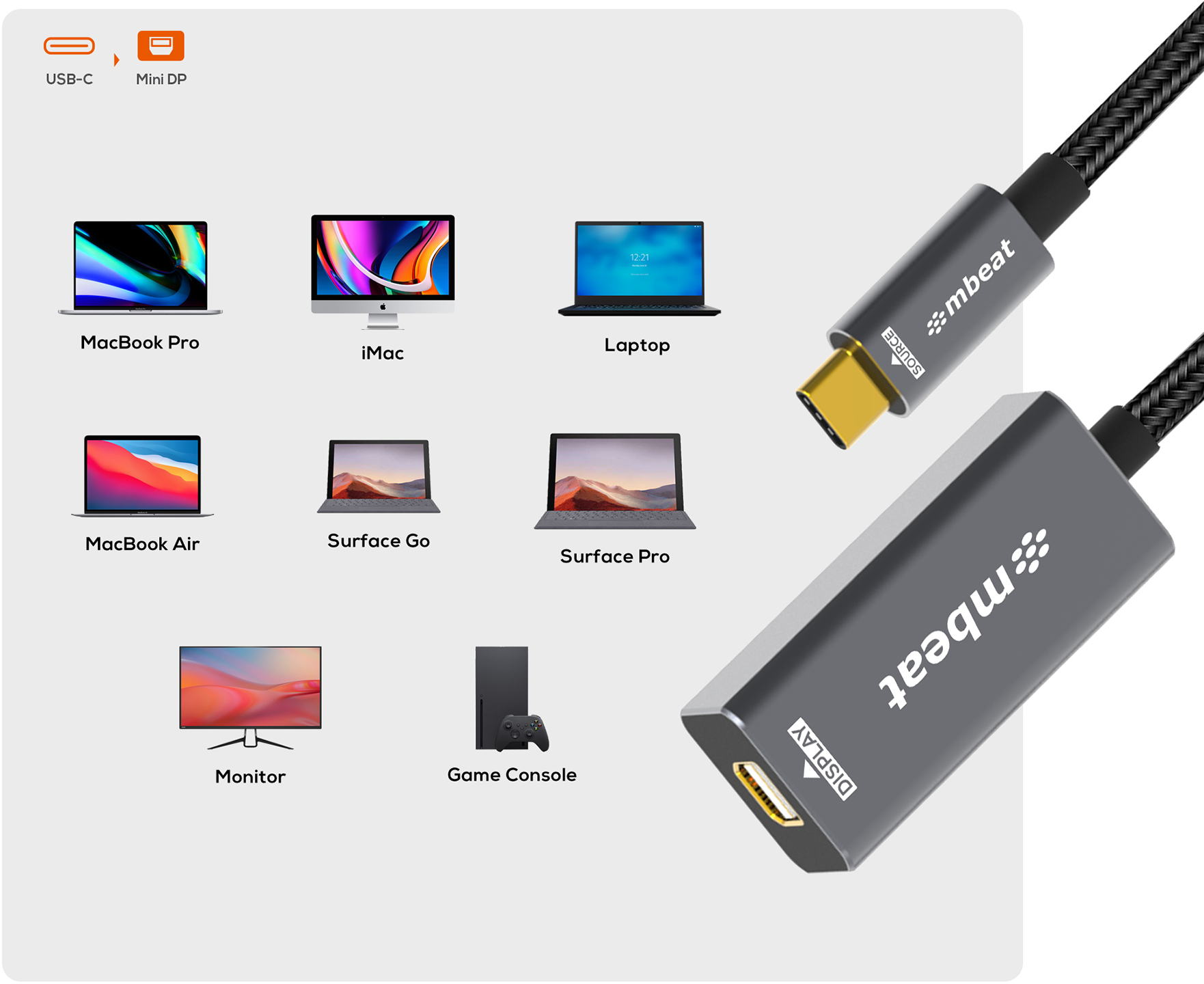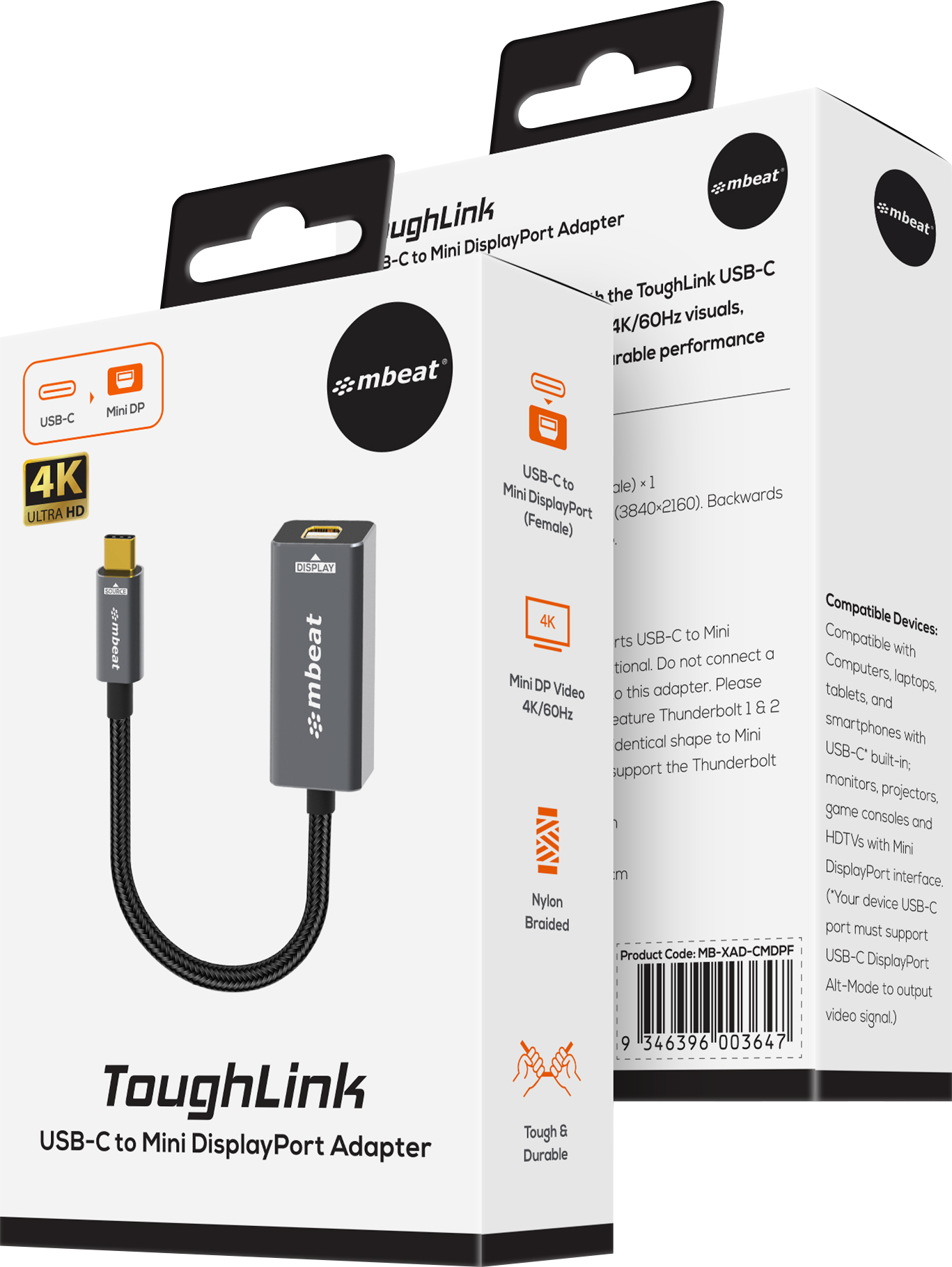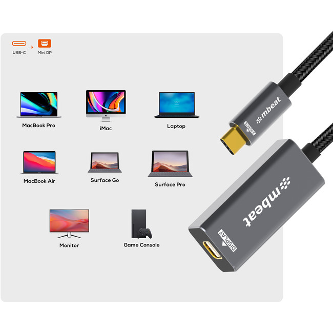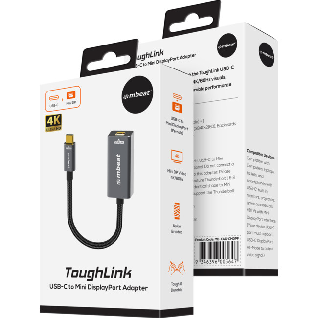 The mbeat Tough Link USB-C to Mini DisplayPort adapter instantly converts USB-C laptops, allowing you to use your existing Mini DisplayPort cable for seamless display connectivity.