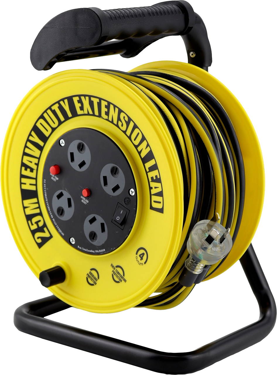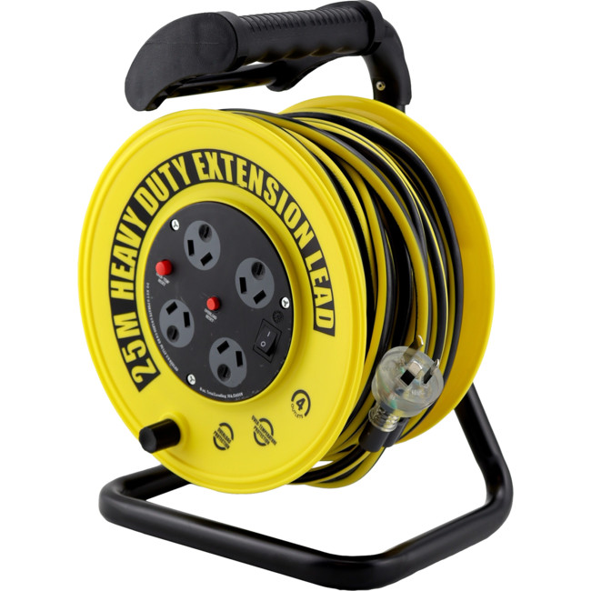25 meter heavy duty power extension cable on a handy reelwith 4 way in-built power board