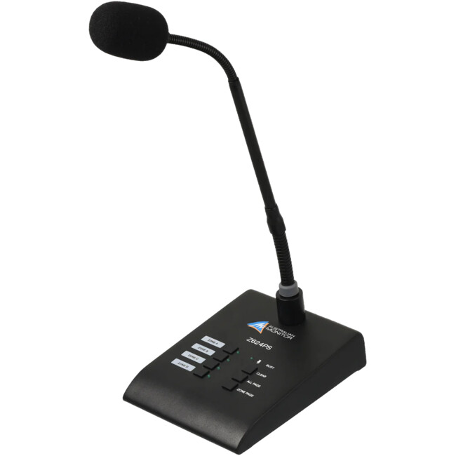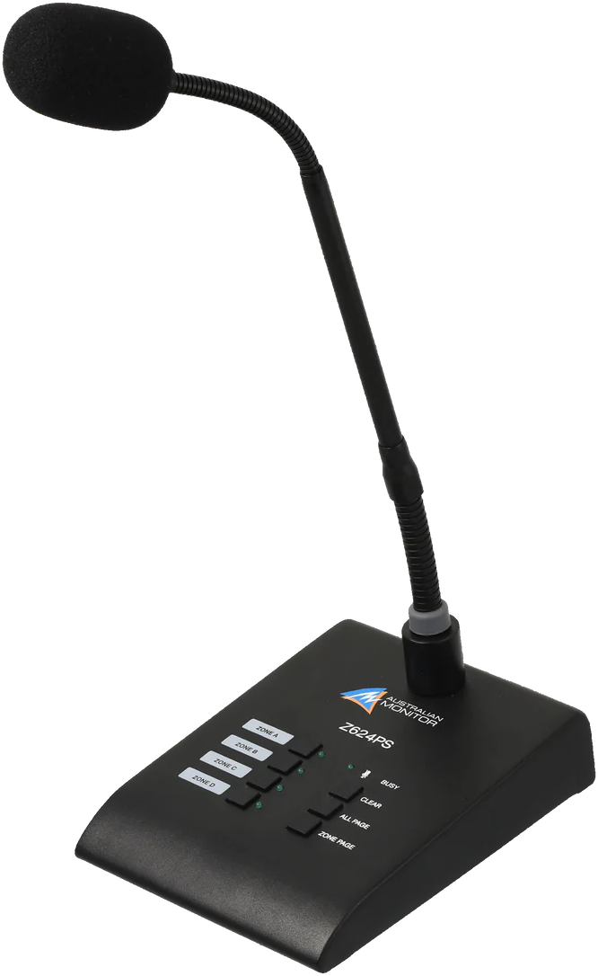 The Z624PS paging station is a paging front end for the Z624 system. Featuring a slimline gooseneck paging microphone and the ability to page any single zone, combination of zones or All Call.