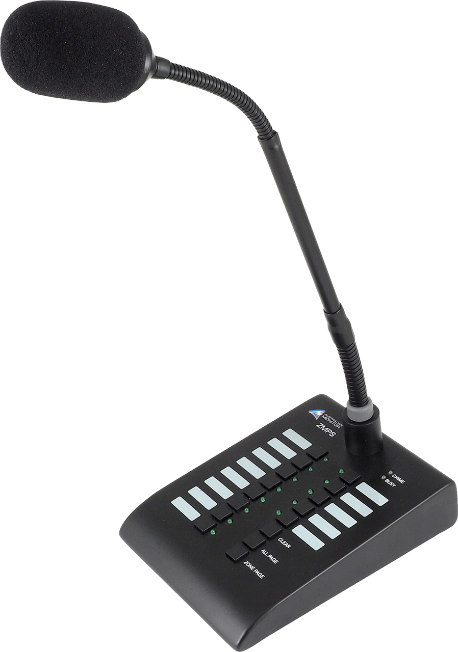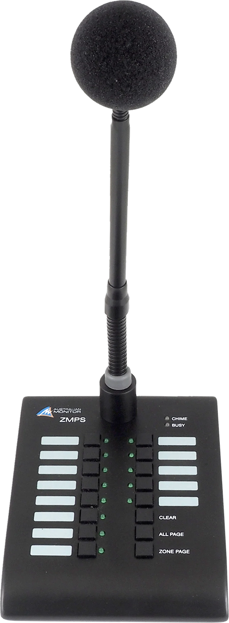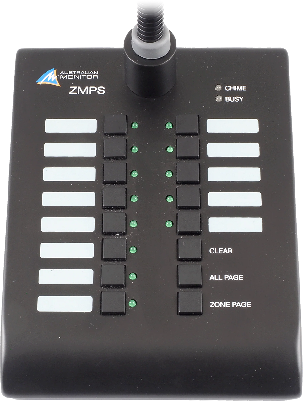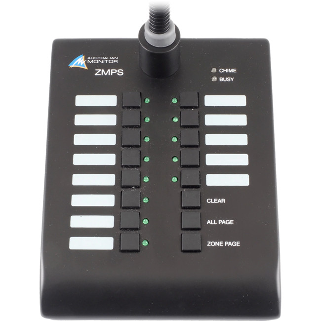 The ZMPS paging station is a programmable paging front end for the ZONEMIX system. Featuring a slimline gooseneck paging microphone and the ability to page any single zone, combination of zones or All Call.