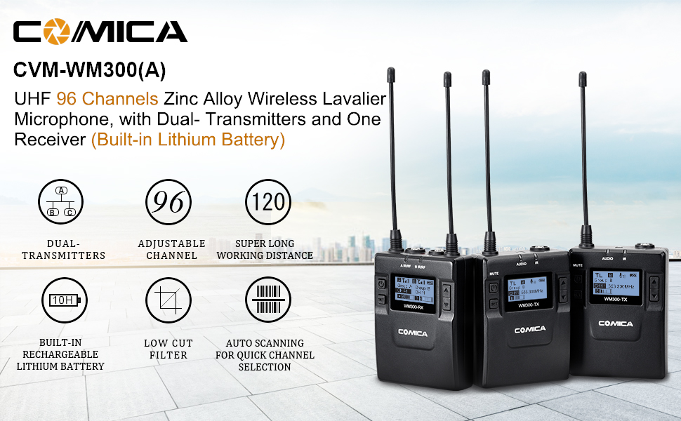 TheComica Audio CVM-WM300Ais a 2-person, camera-mount wireless system that comprises two bodypack transmitters, a dual-channel receiver, and two omnidirectional lavalier microphones. It is powered via built-in, lithium-ion polymer rechargeable batteries, which provide 10 hours of standby time. The system allows you to transmit two mic or line audio signals simultaneously in mono or stereo mode, ideal for interviews or presentations with two speakers or for transmitting a mix when working on ENG, video, or music productions.