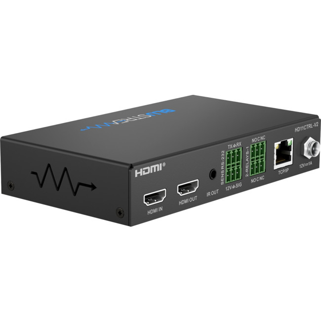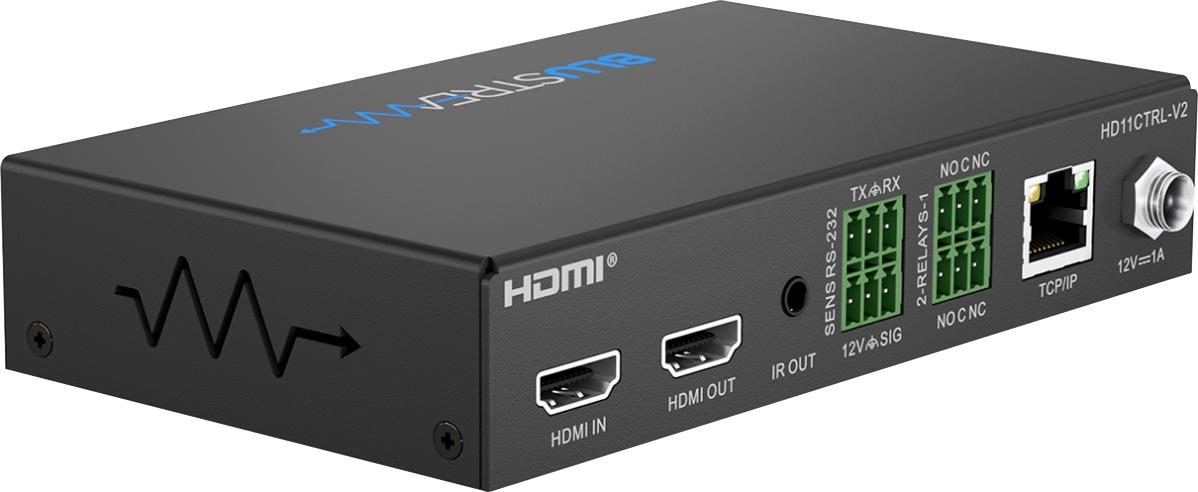 Our HD11CTRL-V2 HDMI in-line controller is a innovative single zone automated control solution. With multiple configuration options, this unit includes RS-232, IR or IP command triggers, display on / off control via CEC, and HDMI signal sensing. External relay inputs allow 3rd party triggers for integration with devices such as sensors or switches. The addition of a web-GUI allows for simple configuration and advanced management and distribution of 3rd party commands and automated processes. The HD11CTRL-V2 will also help with HDMI compatibility, HDCP 2.2, clock stretching, EDID and handshaking issues that can cause problems when distributing HDMI signals, especially 4K. The HD11CTRL-V2 supports full HDMI 2.0 and HDCP 2.2, with video resolutions up to and including 4K @ 60Hz 4:4:4.
