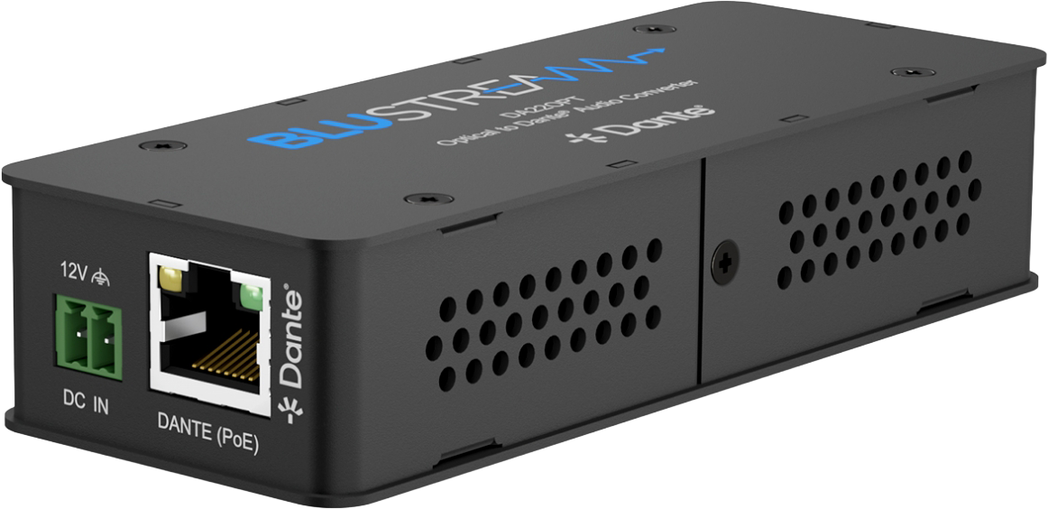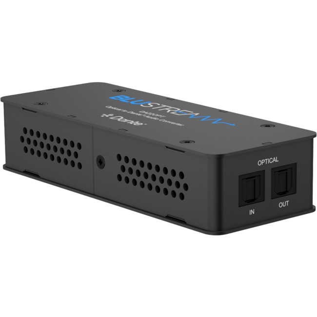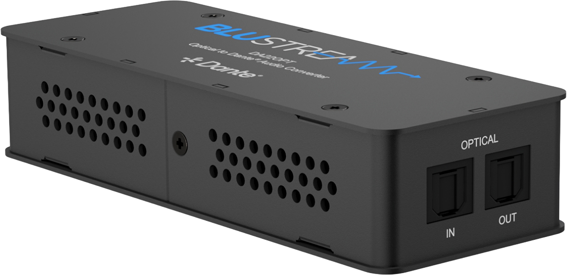 Blustreams DA22OPT has been designed to both encode 2ch optical S/PDIF audio to a Dante® digital signal, and decode a Dante® digital signal to 2ch optical S/PDIF audio.