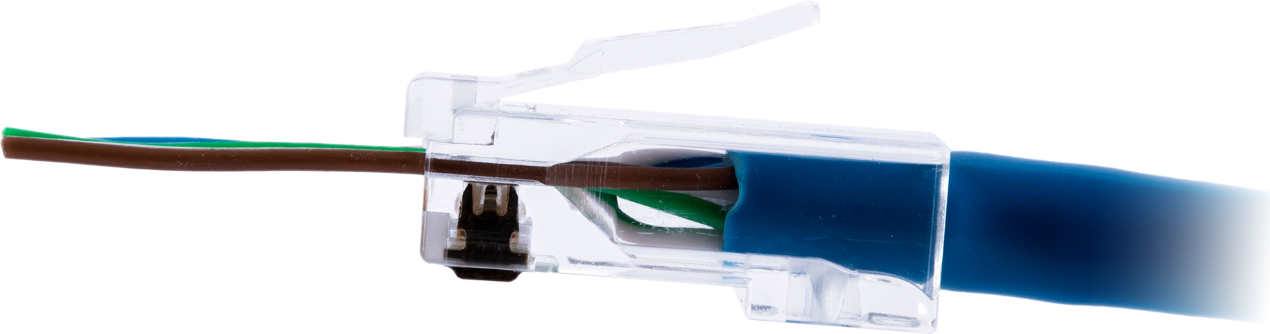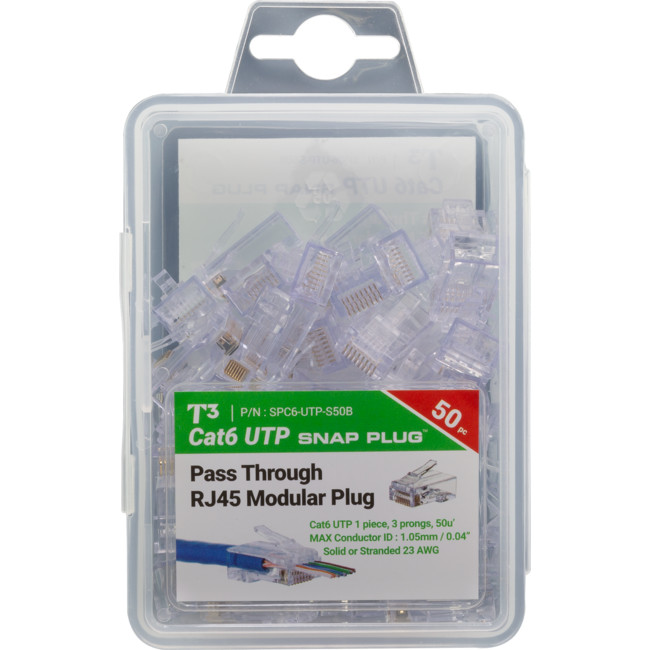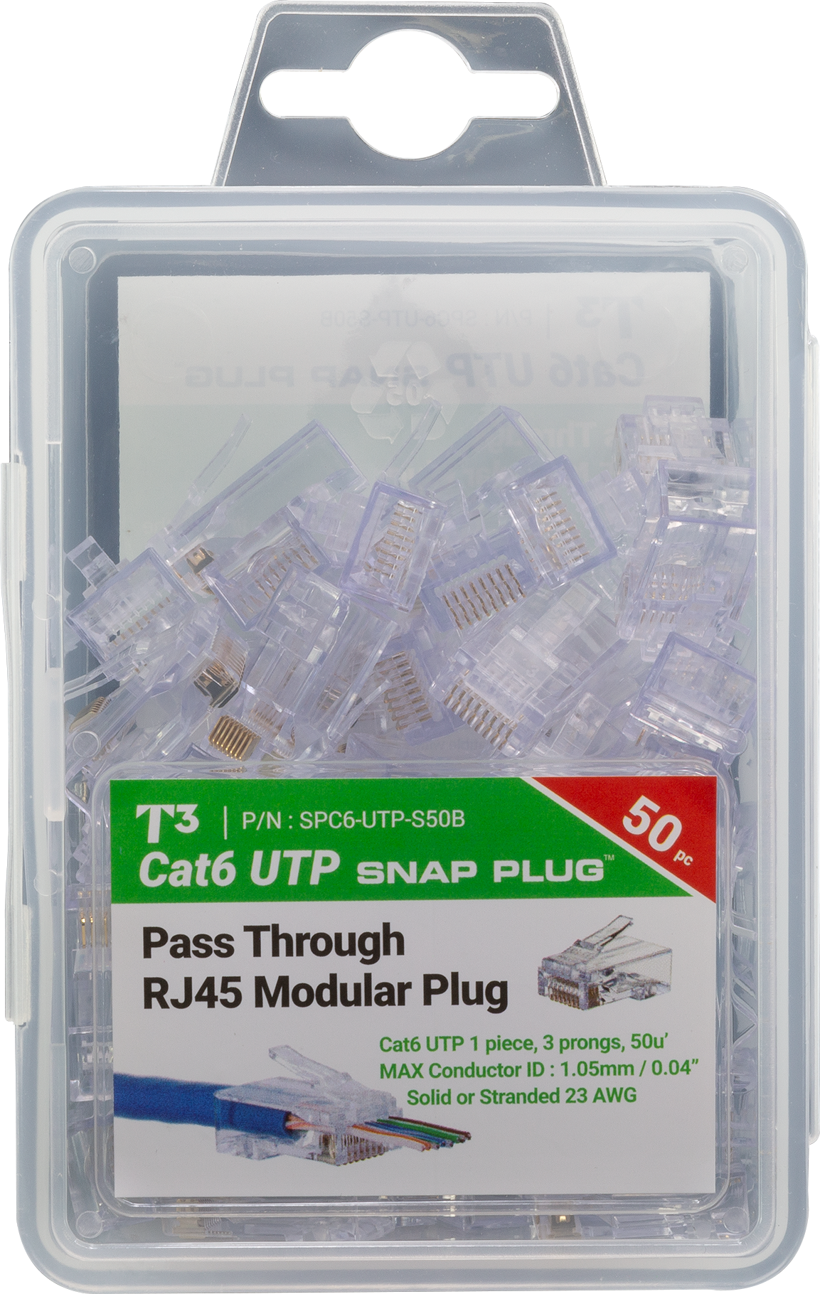 The T3 Snap Plug™ enables the conductors to pass through the connector itself, making it a lot easier to verify wiring order before crimp, reducing possible errors and waste of materials, save time and effort on terminating RJ45 connectors.