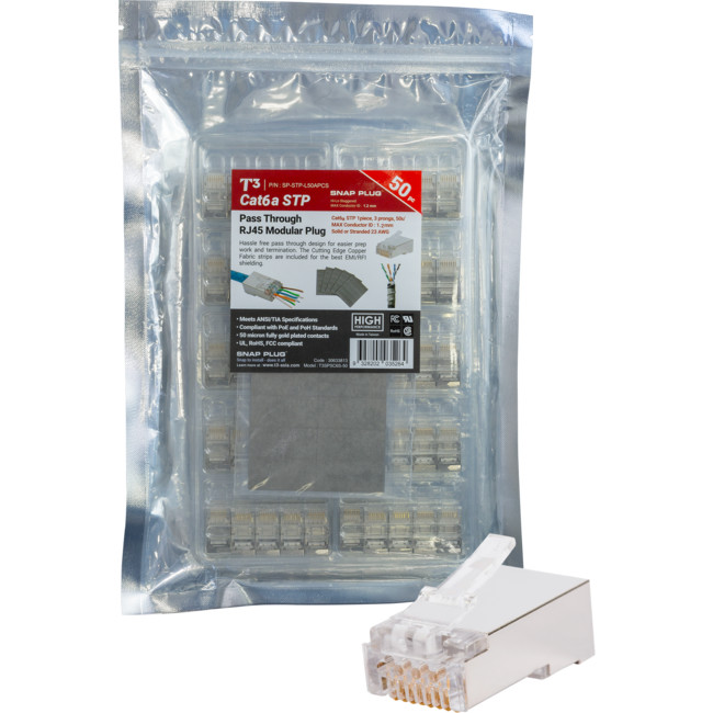 The T3 SNAP PLUG™ enables the conductors to pass through the connector itself, making it a lot easier to verify wiring order before crimp, reducing possible errors and waste of materials, save time and effort on terminating RJ45 connectors. Use the SNAP PLUG TOOL to crimp and trim in a single step, making professional wire termination fast and easy.
