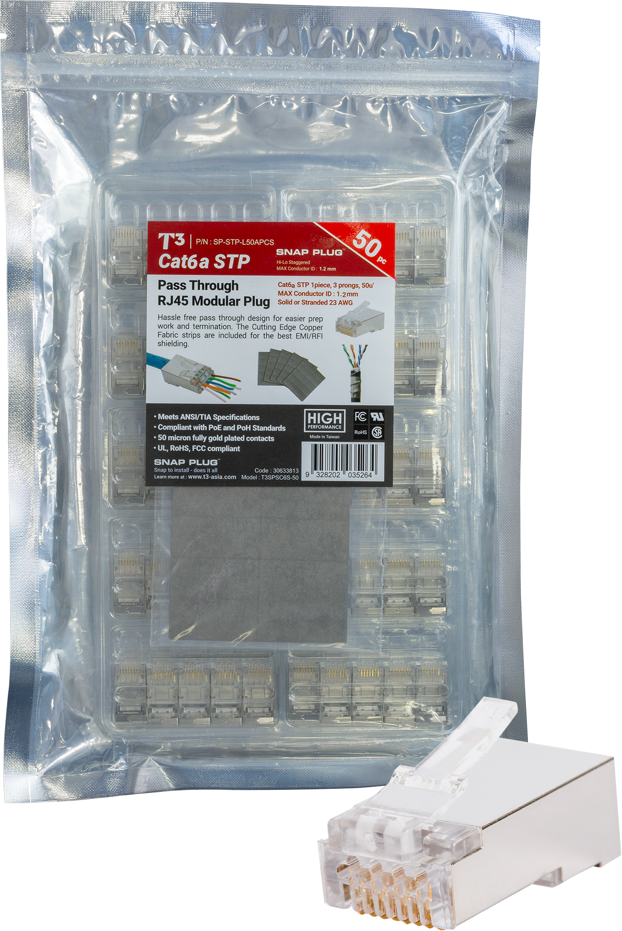 The T3 SNAP PLUG™ and SNAP PLUG Tool are designed to simplify the process of terminating RJ45 modular plugs. It is a time-consuming process to assemble traditional RJ45 modular plugs, and the most difficult part would be putting the wire into the conductor in the correct order. The thicker the conductor is, the more difficult the job is going to be.