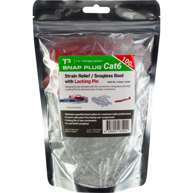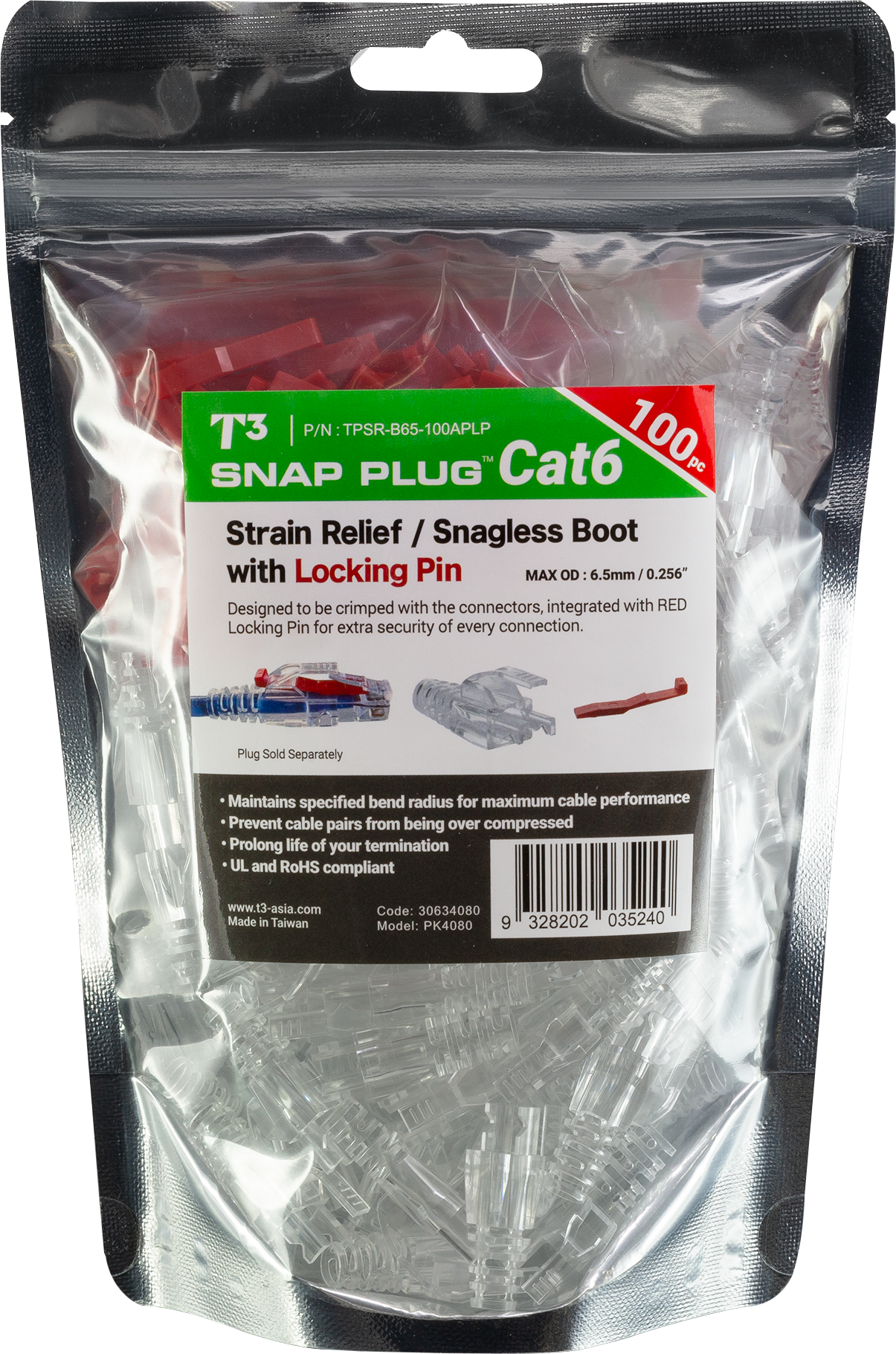 This strain relief and snagles boot is designed to be crimped with the SNAP PLUG Cat6 connector, the plug will lock the strain relief in place, creating one professional, integral assembly.