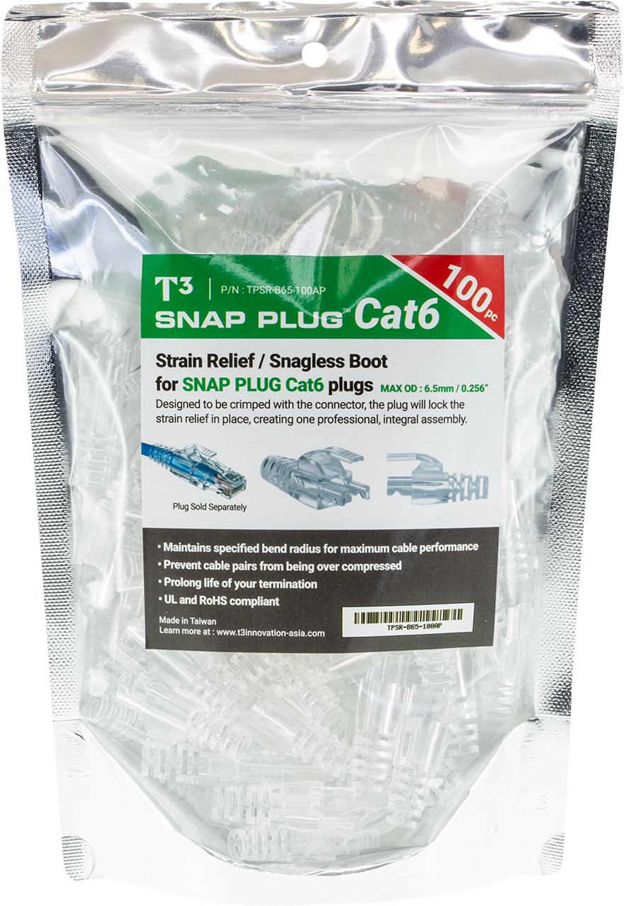This strain relief and snagles boot is designed to be crimped with the SNAP PLUG Cat6 connector, the plug will lock the strain relief in place, creating one professional, integral assembly.