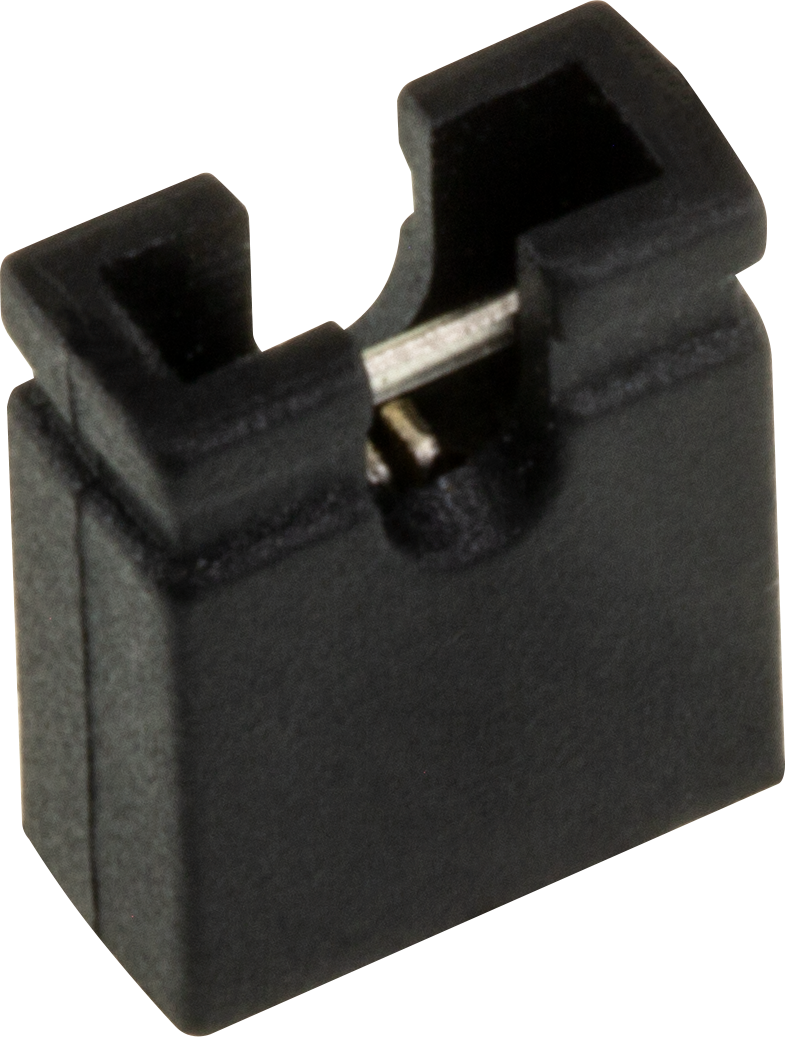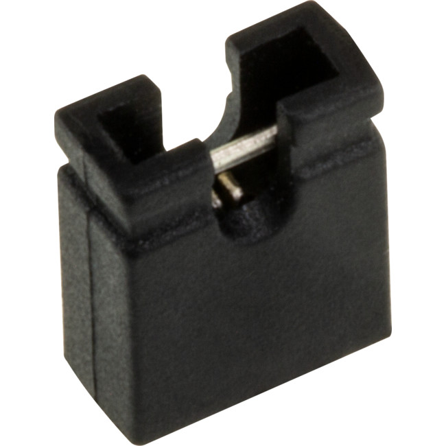 Miniature shunt for plug on programming, eliminates the need for dip switches or soldering.Female two position jumper, Gold plated contacts.