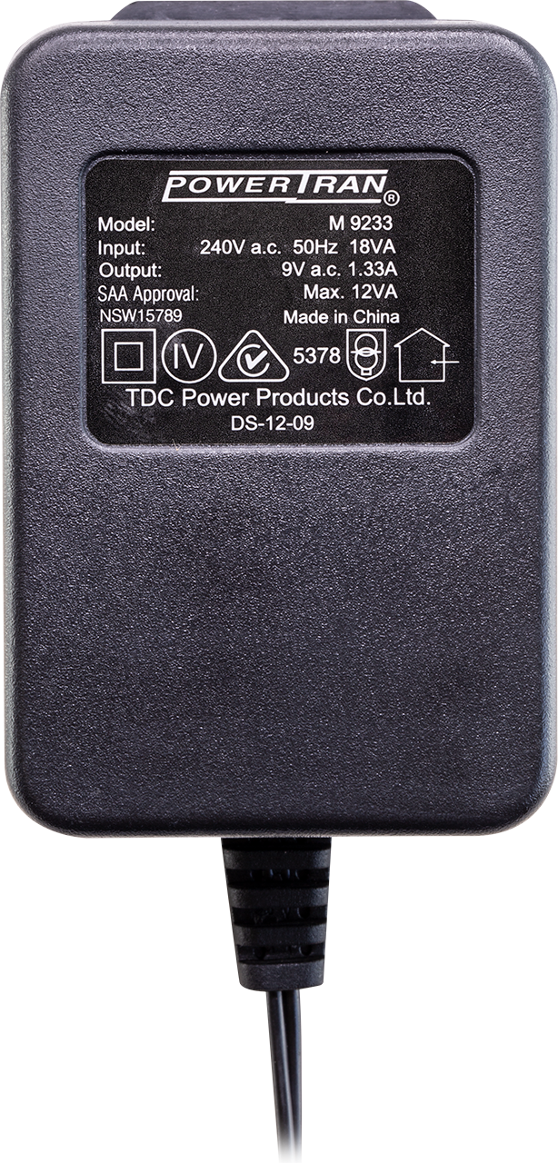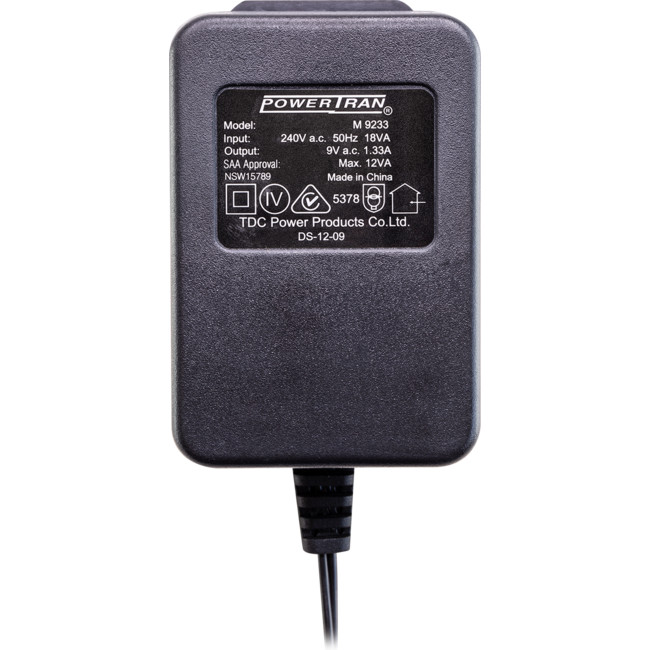 Compact 9V AC plugpack with 1.33A current output. MEPS approved. Dimensions: 80L x 55W x 55D mm Supplied with a removable 2.1mm barrel connection