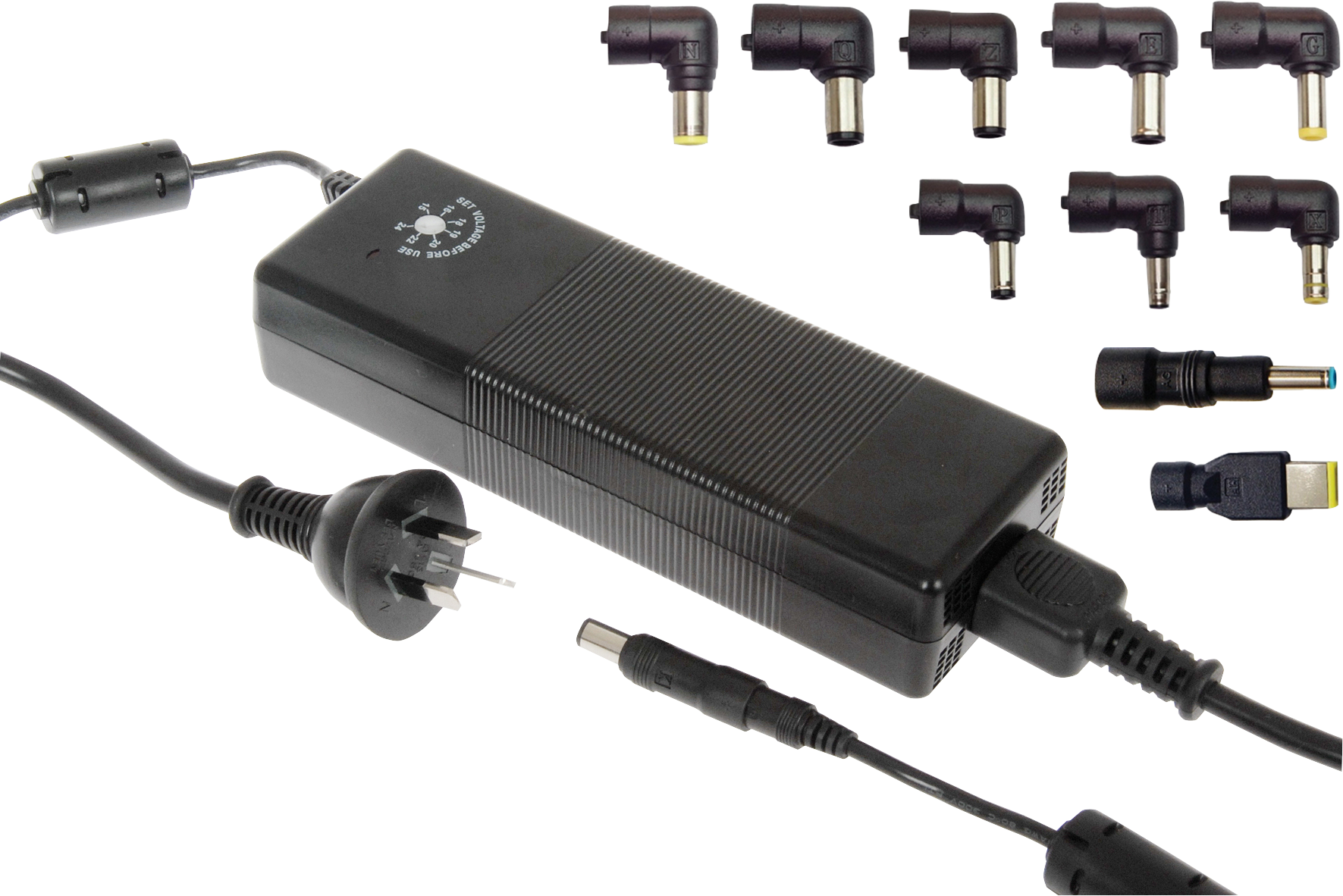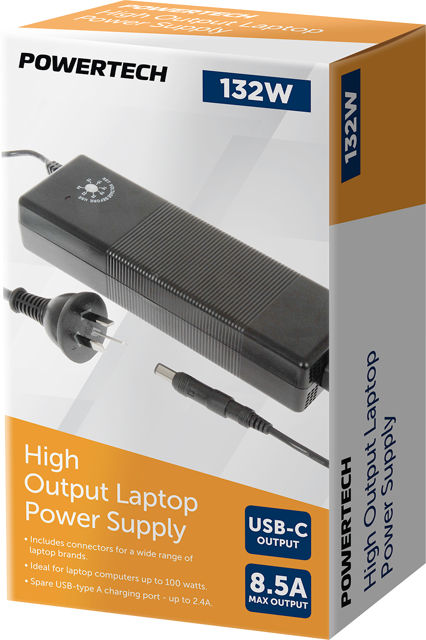 Specifically designed for use with laptop computers, this power supply has a universal input voltage 100-240VAC 50/60Hz and has a regulated output. It features short circuit and overload protection, an LED power indicator and USB output for charging USB devices. The power supply comes with 9 different polarity protected DC adaptors that suit the majority of laptop computer on the market such as: ACER, IBM, DELL, ASUS, Sony, Toshiba, Samsung, Compaq, Sony, Panasonic and more. • 12.0V DC 8.5A • 14.0 / 15.0V DC 7.0A • 16.0 / 18.0V DC 6.5A • 18.5 / 19.0 / 19.5 / 20.0V DC 6.0A • 22.0 / 24.0 DC 5.5A • 134.5W max. • 5V @ 500mA 2.5W (USB A Power)
