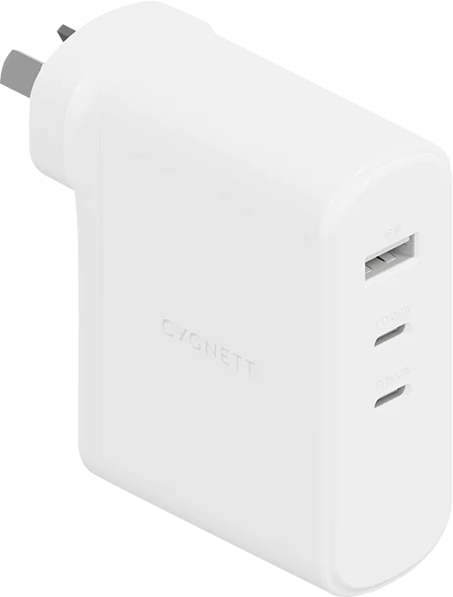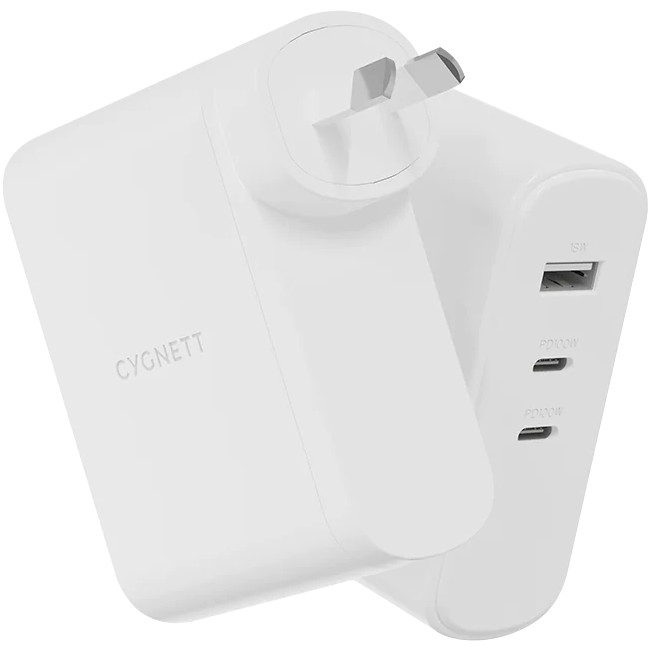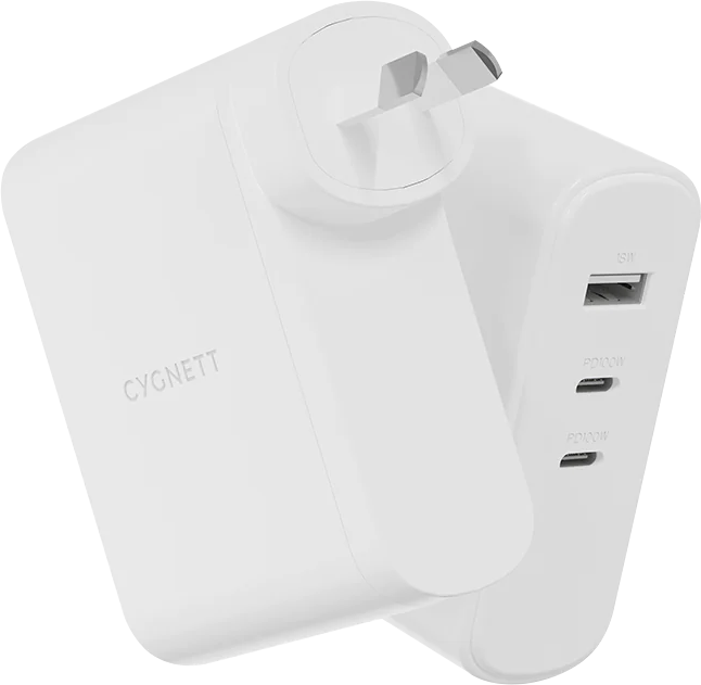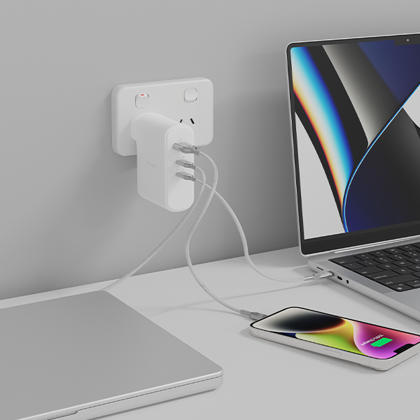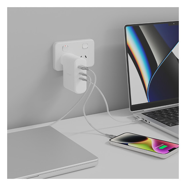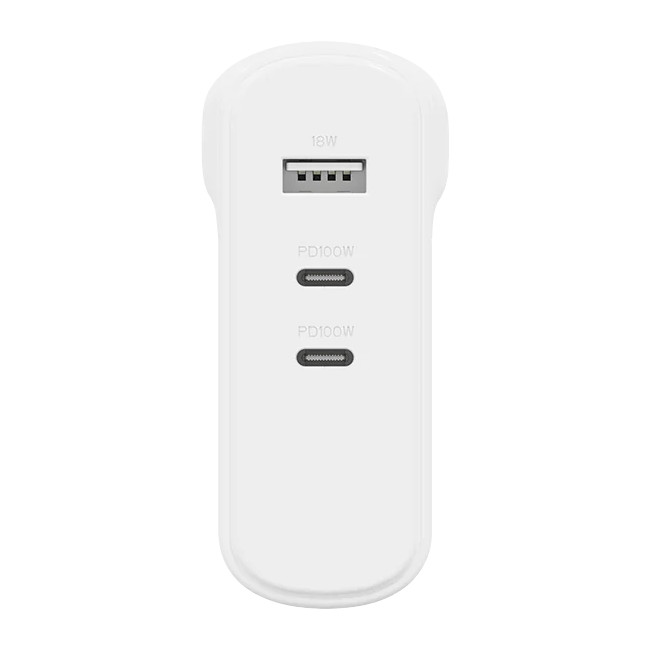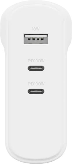 Charge your laptop at max speed Incredible 100W PD charging power from a single USB-C port that will fast charge even the most powerful USB-C laptops, including MacBook Pro, HP, Dell, Microsoft Surface and more. Both USB-C ports on this wall charger are rated to support up to 100W of power (not simultaneously). Charge three devices at the same time Three USB ports to charge three devices at the same time. Charge any combination of a laptop, phone, tablet, earbuds, headphones, portable gaming console, simultaneously. This wall charger packs two USB-C ports along with a single USB-A port. Intelligent power sharing Enjoy up to 100W PD power from a single USB-C port or connect up to three devices and the power is intelligently distributed across all ports. Fast charging support for a wide range of devices This charger supports the fast charging speeds for a wide range of devices, including popular Apple devices like iPhone, iPad, Apple Watch, AirPods, as well as popular USB-C phones and tablets from brands like Samsung. You GaN charge with confidence Gallium nitride (GaN) has the competitive edge when it comes to safely and efficiently delivering incredible charging power from a compact design. GaN technology allows all the internal components to be closer together without the challenges of overheating or overcharging.