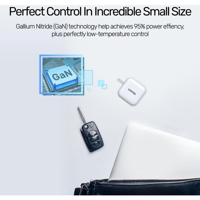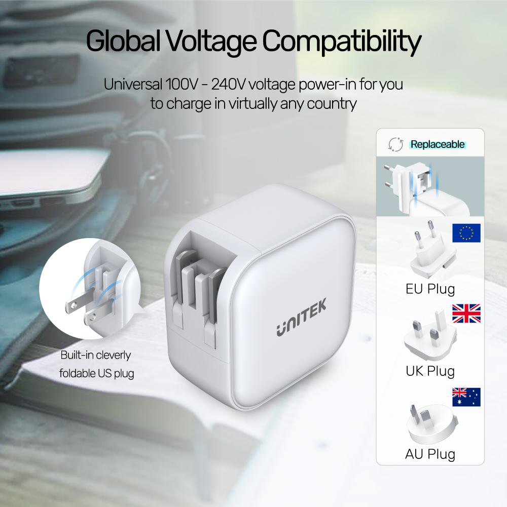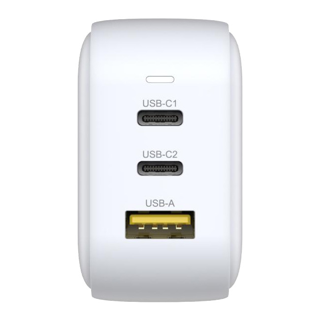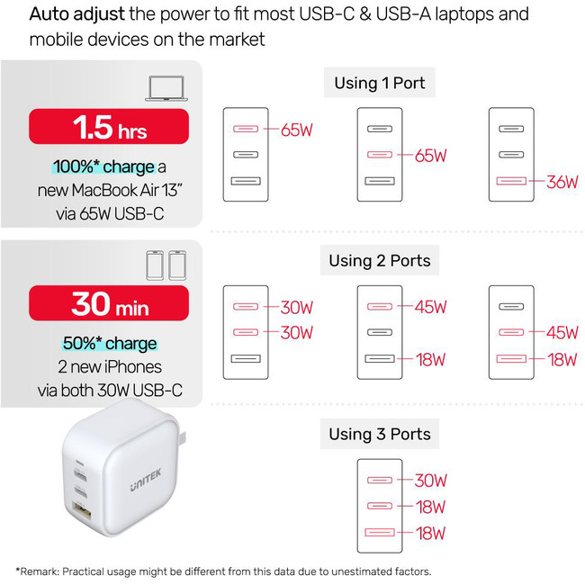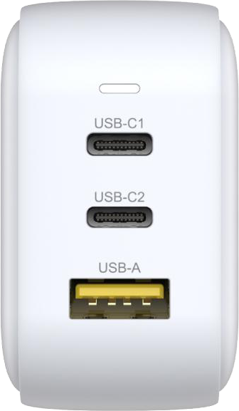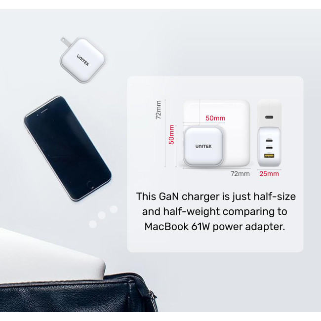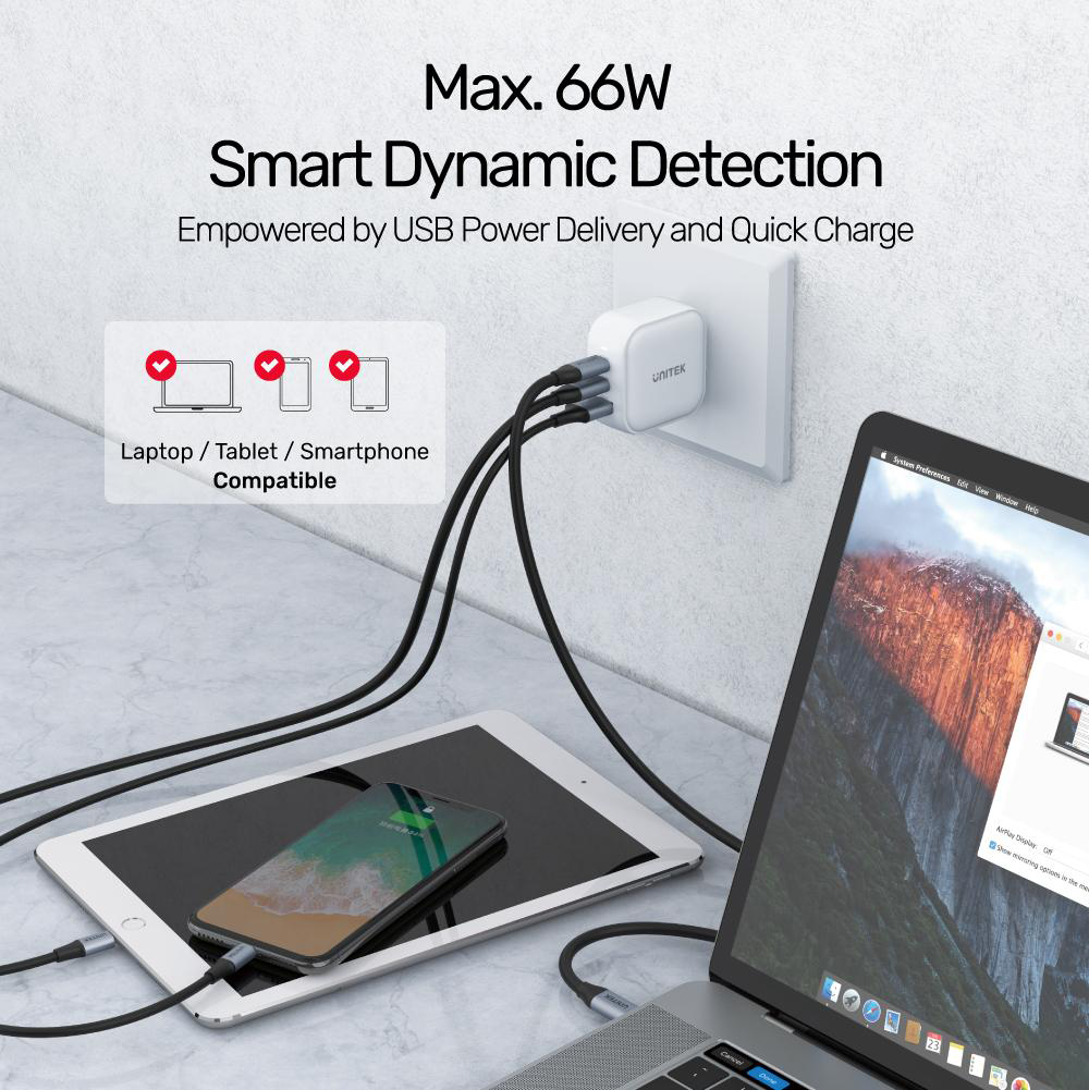 • Superior in craftsmanship and performance. • Powerful GaN(gallium nitride) technology offers super-efficiency at current-transferring with low heat generation which also results in a compact and lightweight design. • This travel charger can be applied globally. It equips foldable US plug and comes with EU, UK and AU adapterfor replacement and supports the voltage-input under AC 100~240V, 50~60Hz, 1.7A Max. • While with a single connection, USB-C Power Delivery(PD) port offers maximum 65W applying on laptop e.g.MacBook Air, and Qualcomm Quick Charge 3.0 USB port offers maximum 36W, meets most of the smartphones and tablets. • In dual connections of both USB-C, it results in evenly maximum 30W power output. In another situation, USB-Cwill be in maximum 45W plus USB-A in maximum 18W. • When all three ports connecting with devices, the 1st USB-C offers maximum 30W, 2nd USB-C and the USB-A in 18W. Total power output is 66W. • Built-in four intelligent protection circuits against overvoltage, overcurrent, overheat and short circuit. • With LED indicator, clearly express the working status.