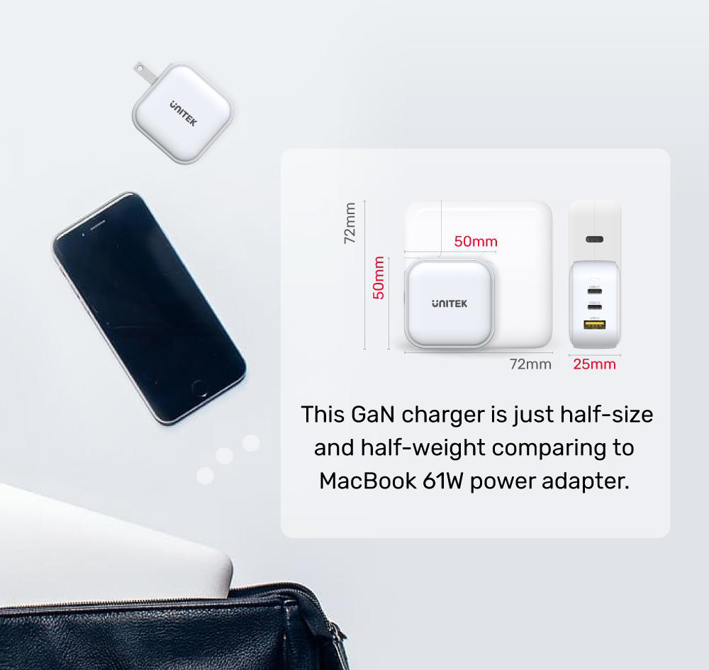 Gallium nitride (GaN) is a high-performance charger compare to the traditional silicon used in charging devices.Itachieves high power output with a compact size, ideal for charging anywhere.This3 ports Black GaN charger equips with 2 x USB-C PD ports and 1 x USB-A QC port, together with replaceable plugs working worldwide for your laptops like MacBook Air, or tablets and smartphones, even when you're travelling abroad.