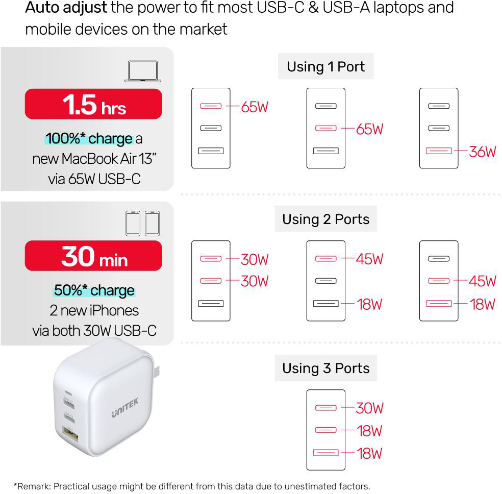 -USB-C x 2: Max. 65W (USB Power Delivery Supported) -USB-A: x 1: Max. 36W (Quick Charge Supported)