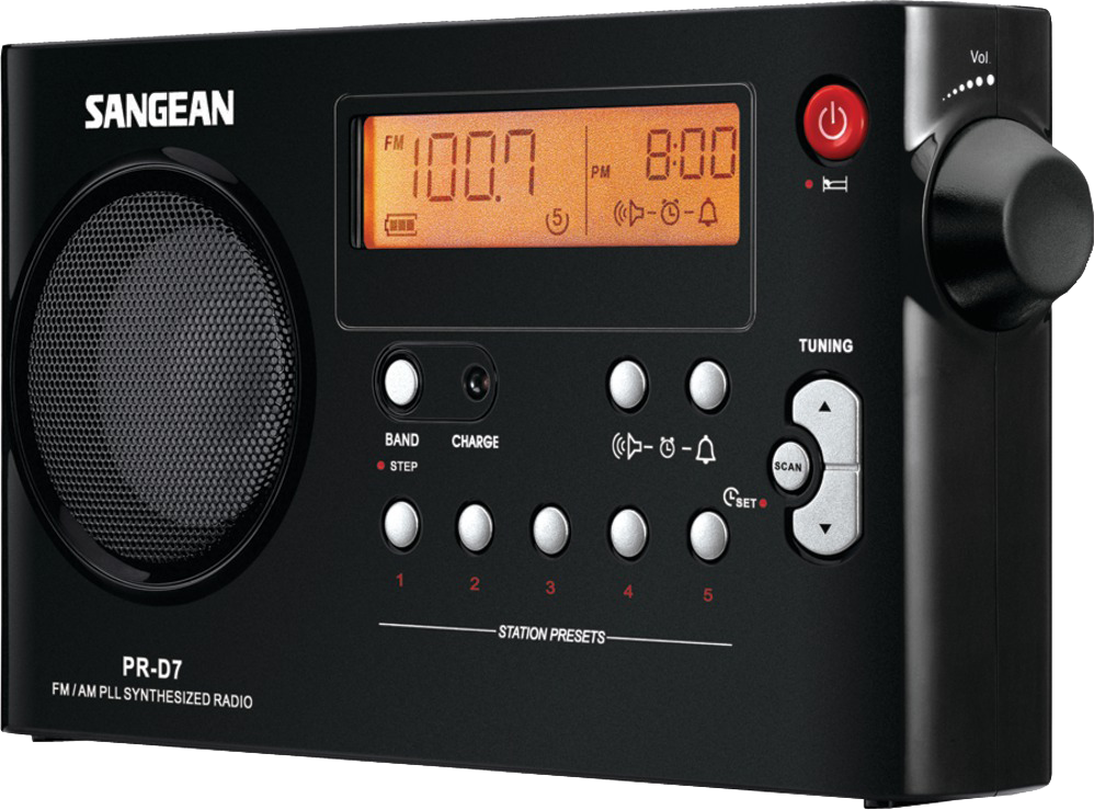 The PR-D7 is a lightweight and convenient portable AM/FM radio with very good performance. You can power it with the included AC Adapter, or six "AA" size batteries (not included). If you use it with rechargeable batteries, you can charge them right in the radio. The PR-D7 conveniently displays radio frequency and time of day at the same time.