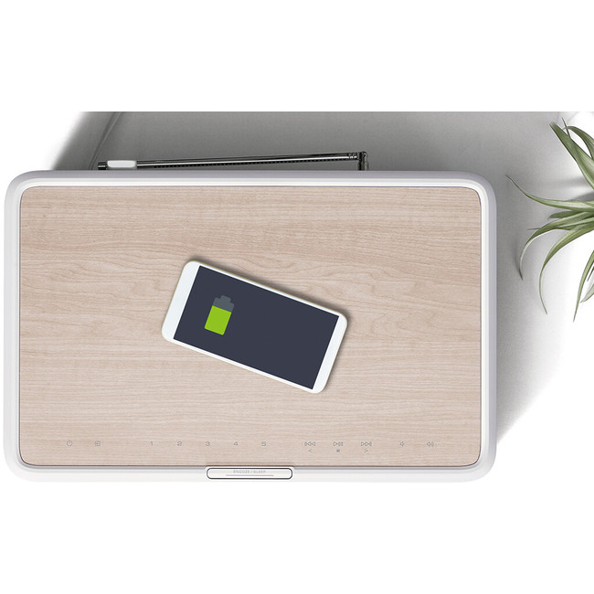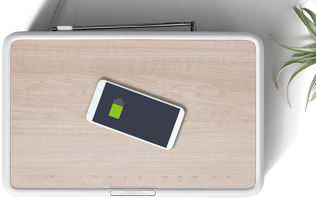 The built-in Qi wireless charging feature conveniently charges your compatible smartphone on the shelf top.