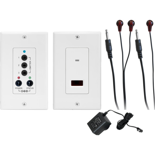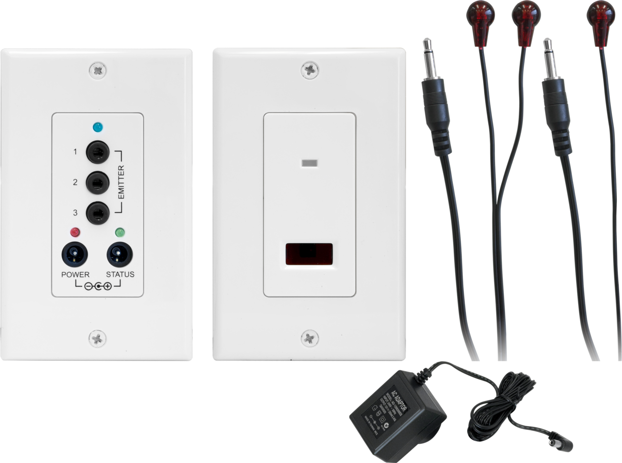 The PRO1255 IR repeater wall plate kit connects the IR connecting block, IR receiver, IR emitter, and power supply together to interface the IR system to Audio/Video components.