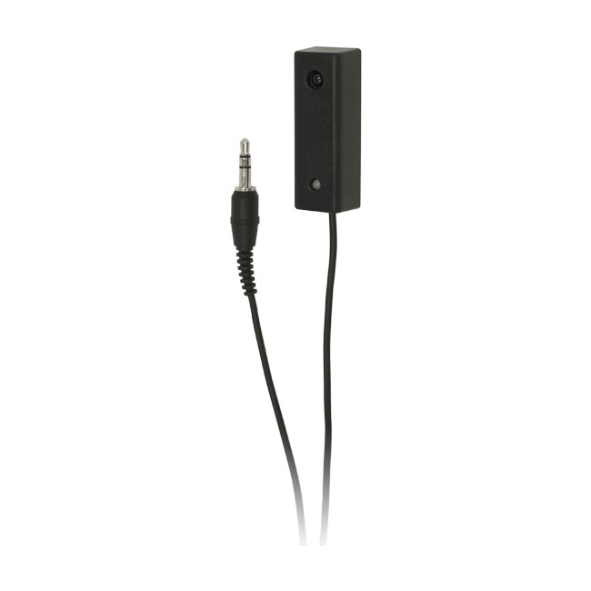 Receives IR signals from a handheld IR remote control and relays this signal to the audio/video equipment for operation from another room. The receiver has a non-skid base and is placed on a flat surface.