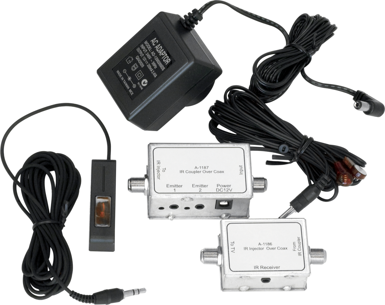 This kit allows IR signals to be inserted onto a coax cable in one location and extracted from coax on another location.