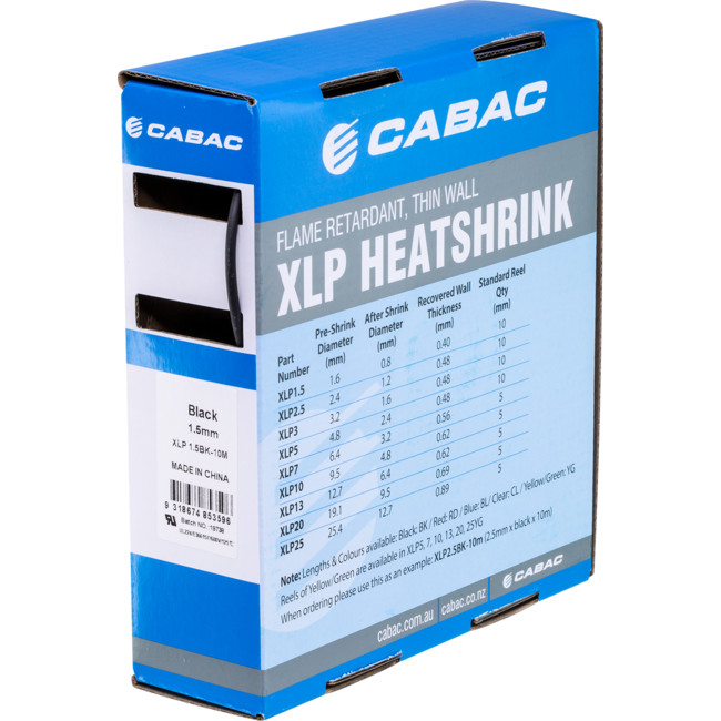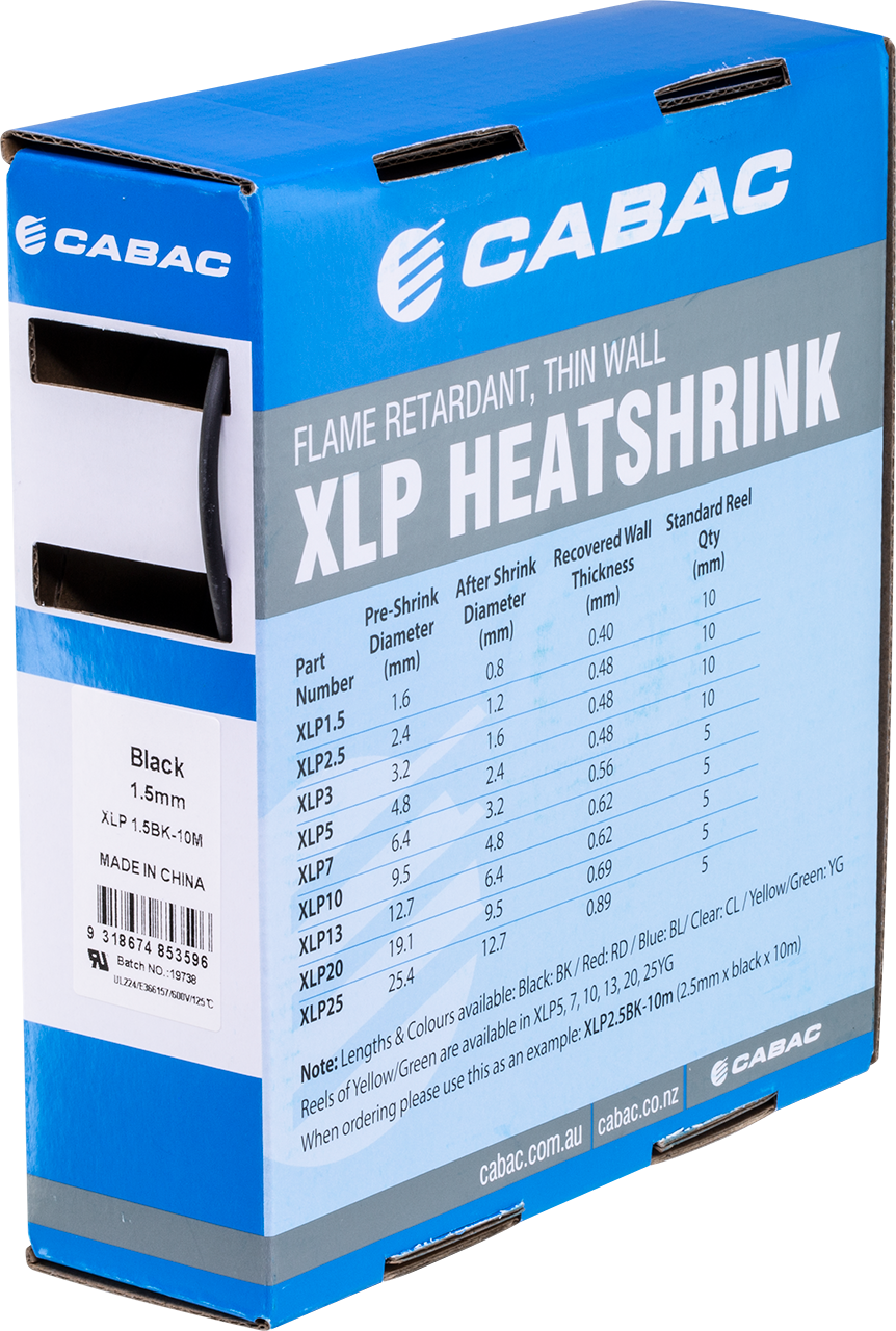 The CABAC XLP range of thin wall heat shrink tubing is used to insulate, protect and colour code conductors in a range of applications related to the electrical and associated industries. This general-purpose heat shrink provides electrical and mechanical protection, while also defending against environmental factors such as common fluids and/or solvents. Our blue thin wall heat shrink sleeving is flexible, flame retardant, and resistant to impact, abrasion and UV radiation. The XLP range of heat shrink tubing is made from polyolefin that has been cross-linked using high-energy electron beam technology. Upon the application of heat, the tubing will shrink down to approximately 50% of its pre-shrink diameter to deliver tight-fitting electrical and environmental insulation. To shrink our heat shrink tubing, we recommend the use of a CABAC heat gun (Part No. HG2232 or HG2233). CABAC blue polyolefin heat shrink tubing is UL certified and complies with a number of international standards, including ASTM D2671.