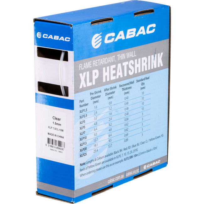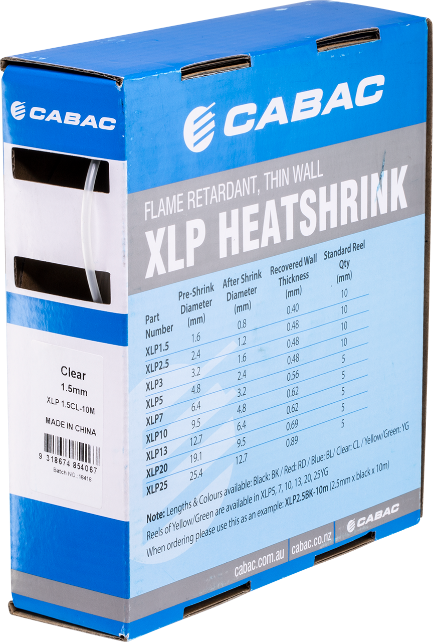 The XLP range of heat shrink tubing is made from polyolefin that has been cross-linked using high-energy electron beam technology. Upon the application of heat, the tubing will shrink down to approximately 50% of its pre-shrink diameter to deliver tight-fitting electrical and environmental insulation. To shrink our heat shrink tubing, we recommend the use of a CABAC heat gun (Part No. HG2232 or HG2233).