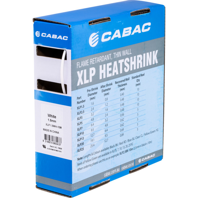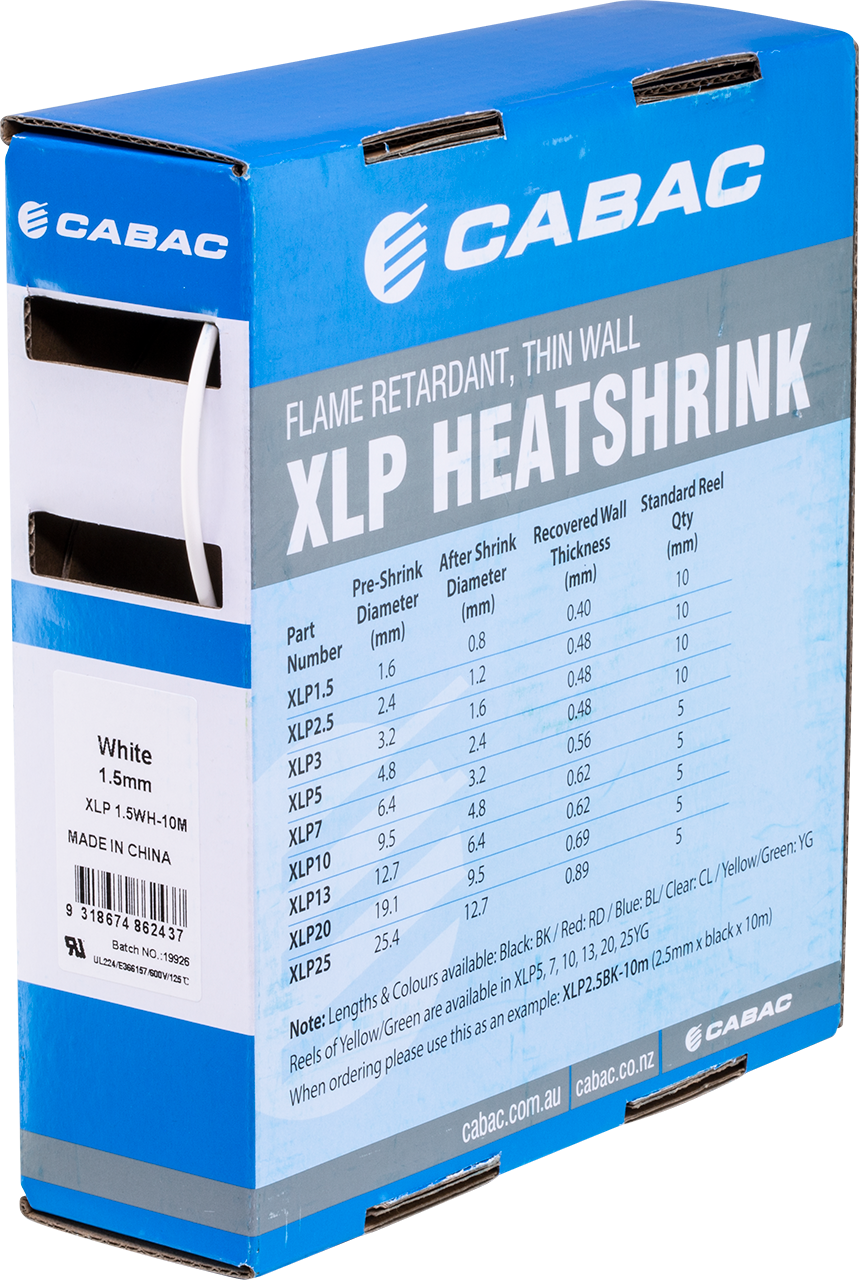 The XLP range of heat shrink tubing is made from polyolefin that has been cross-linked using high-energy electron beam technology. Upon the application of heat, the tubing will shrink down to approximately 50% of its pre-shrink diameter to deliver tight-fitting electrical and environmental insulation. To shrink our heat shrink tubing, we recommend the use of a CABAC heat gun (Part No. HG2232 or HG2233).