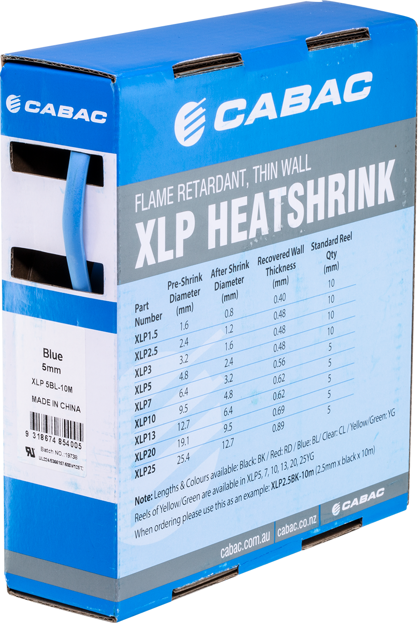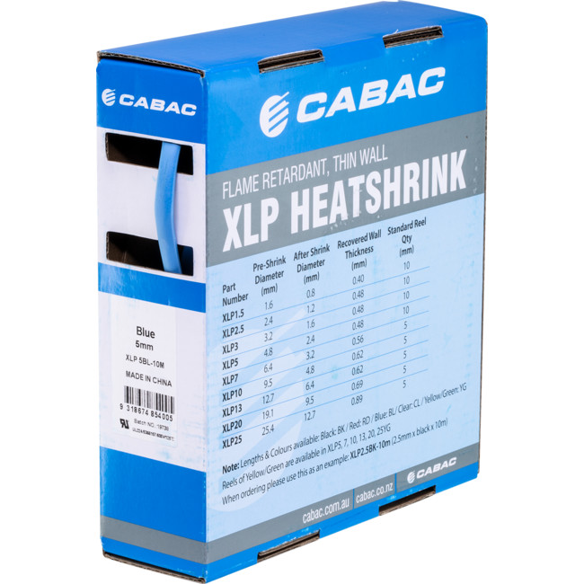 The CABAC XLP range of thin wall heat shrink tubing is used to insulate, protect and colour code conductors in a range of applications related to the electrical and associated industries. This general-purpose heat shrink provides electrical and mechanical protection, while also defending against environmental factors such as common fluids and/or solvents. Our blue thin wall heat shrink sleeving is flexible, flame retardant, and resistant to impact, abrasion and UV radiation.