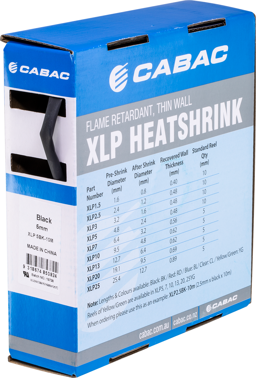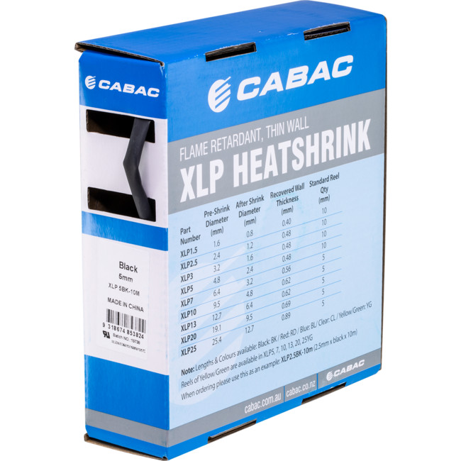 The XLP range of heat shrink tubing is made from polyolefin that has been cross-linked using high-energy electron beam technology. Upon the application of heat, the tubing will shrink down to approximately 50% of its pre-shrink diameter to deliver tight-fitting electrical and environmental insulation. To shrink our heat shrink tubing, we recommend the use of a CABAC heat gun (Part No. HG2232 or HG2233).
