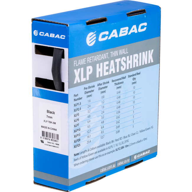 Pre-shrink diameter: 6.4mm After-shrink diameter: 3.2mm Recovered wall thickness: 0.56mm Length: 5m box XLP tubing is available in a wide range of colours and sizes from 1.5mm to 125mm. The product datasheet includes a selection chart for your reference, see Resources.